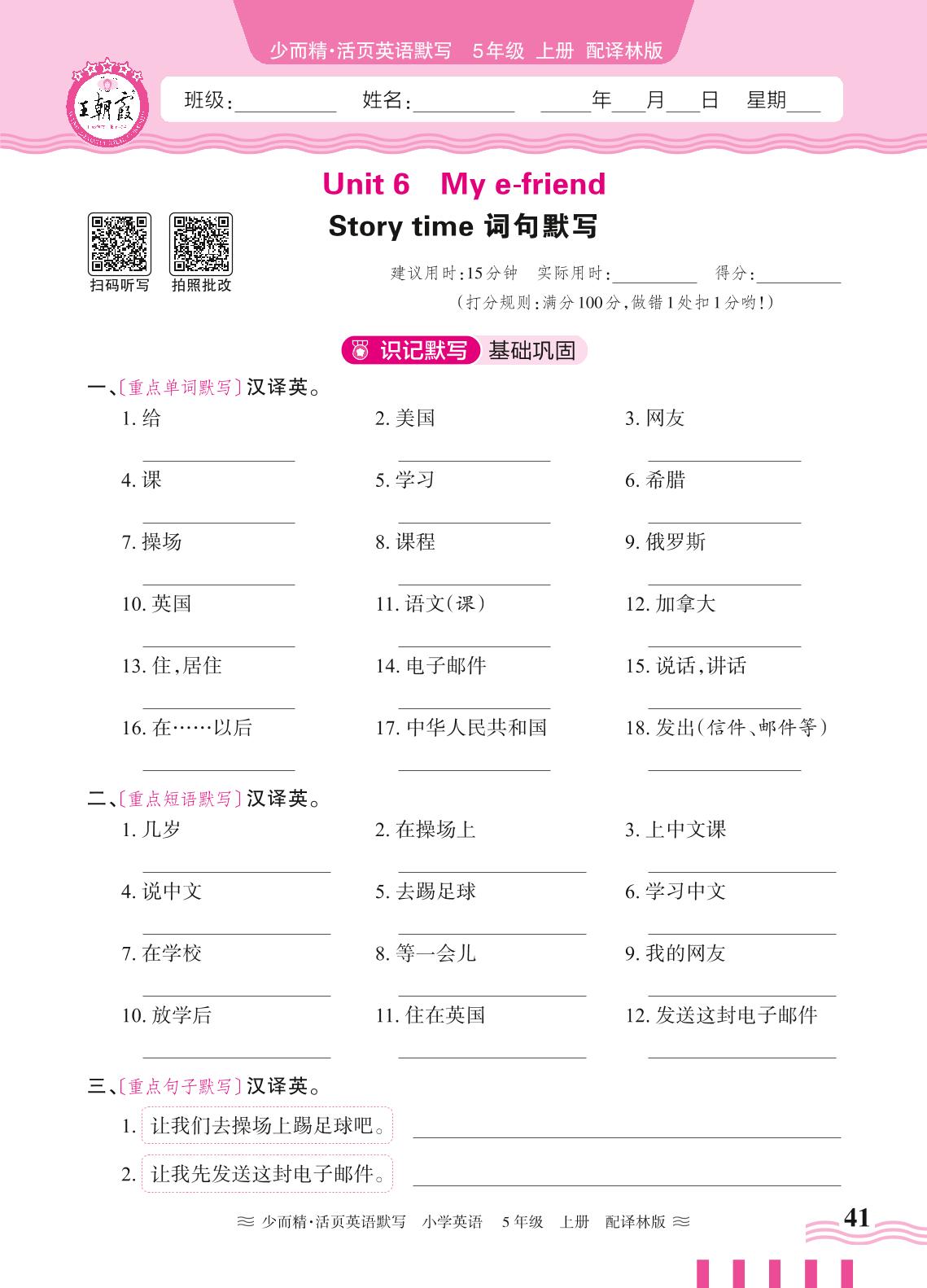 2024秋上册五年级英语译林版(三起始) Unit 6 Story time 词句默写
