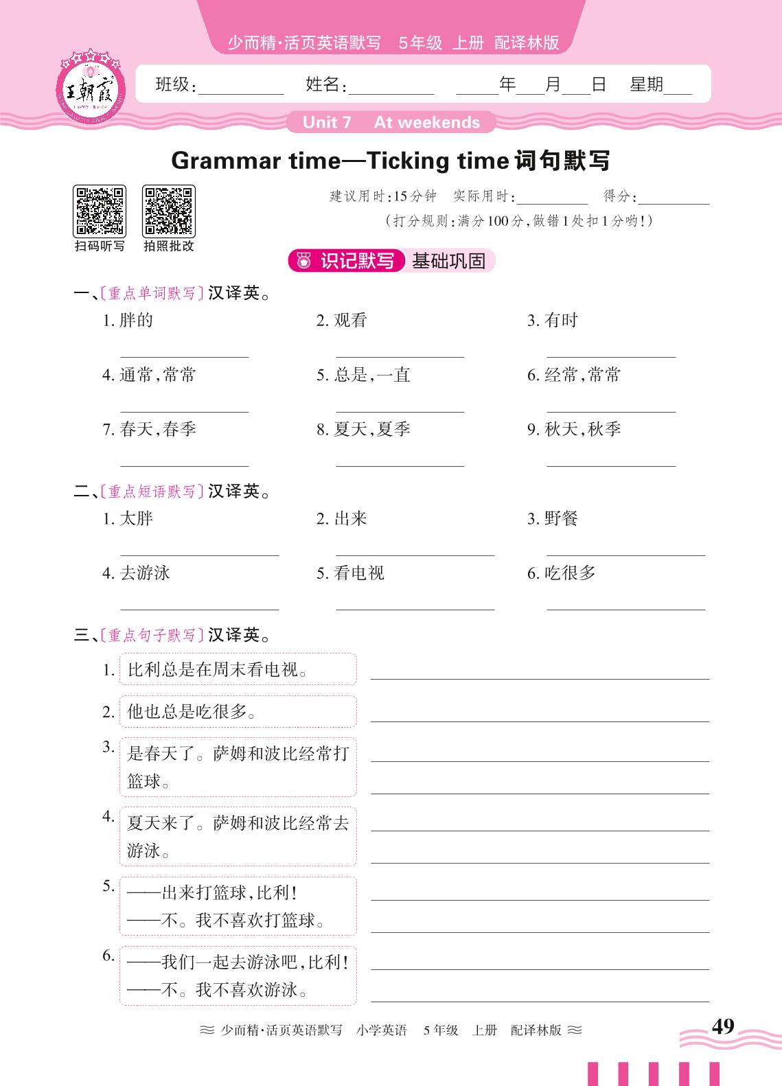 2024秋上册五年级英语译林版(三起始) Unit 7 Grammar time—Ticking time 词句默写