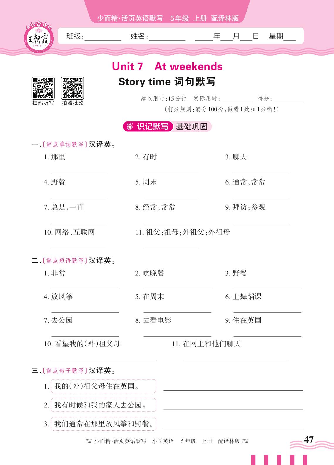 2024秋上册五年级英语译林版(三起始) Unit 7 Story time 词句默写