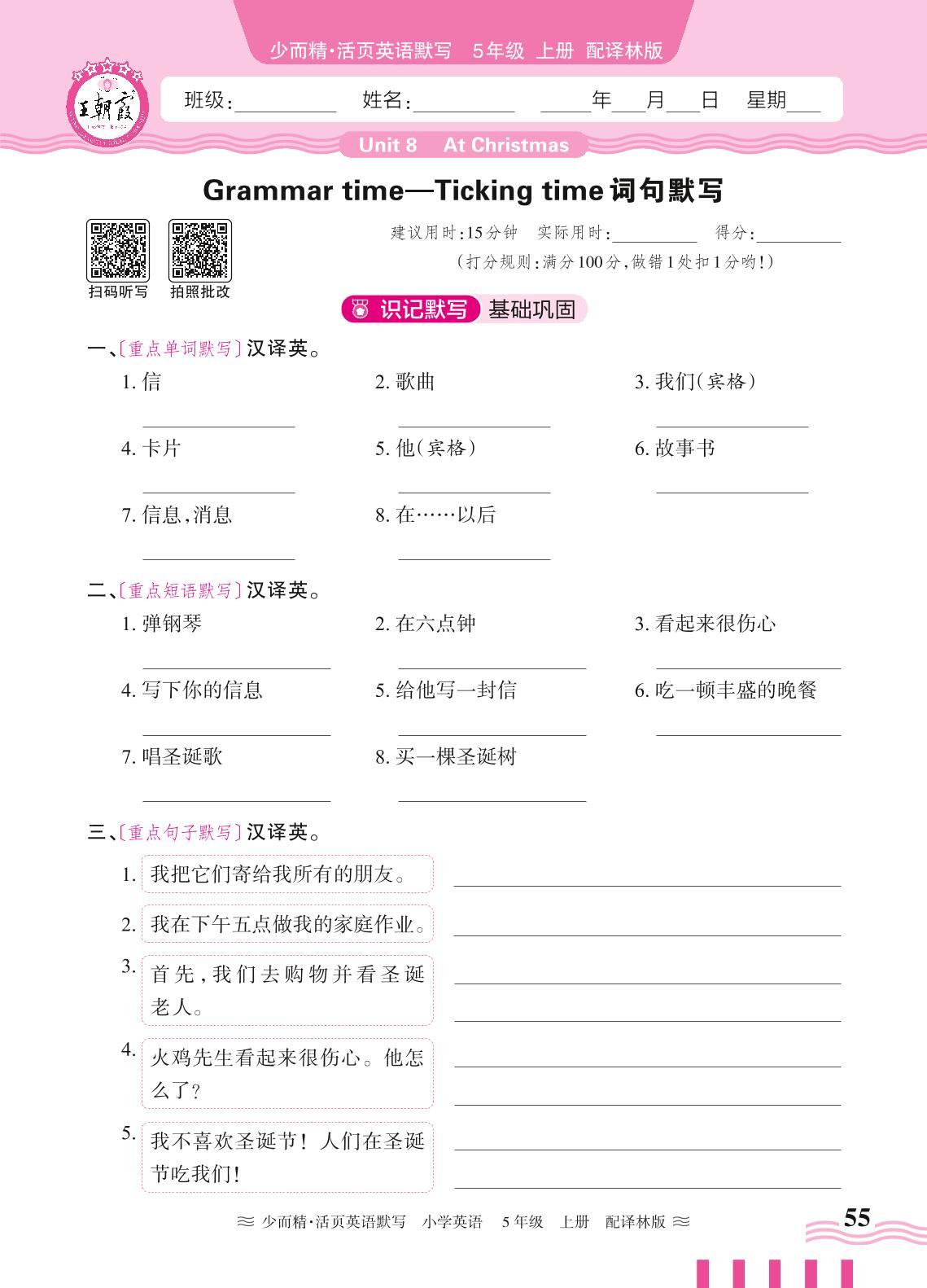 2024秋上册五年级英语译林版(三起始) Unit 8 Grammar time—Ticking time 词句默写