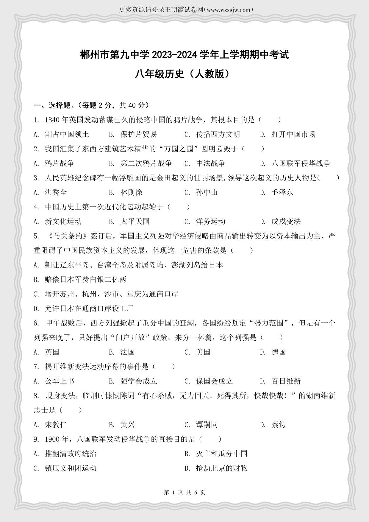 湖南省郴州市第九中学2023~2024学年上学期期中考试八年级历史(人教版)