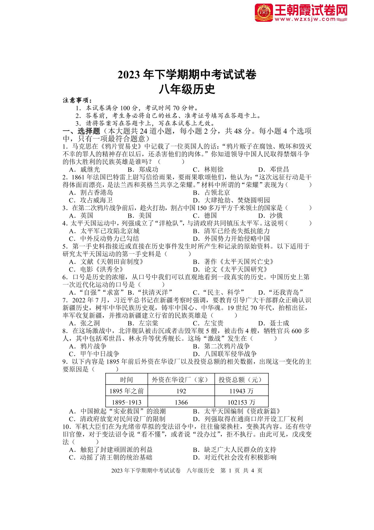 湖南省邵阳市武冈市2023-2024学年第一学期期中考试试卷八年级历史(人教版)