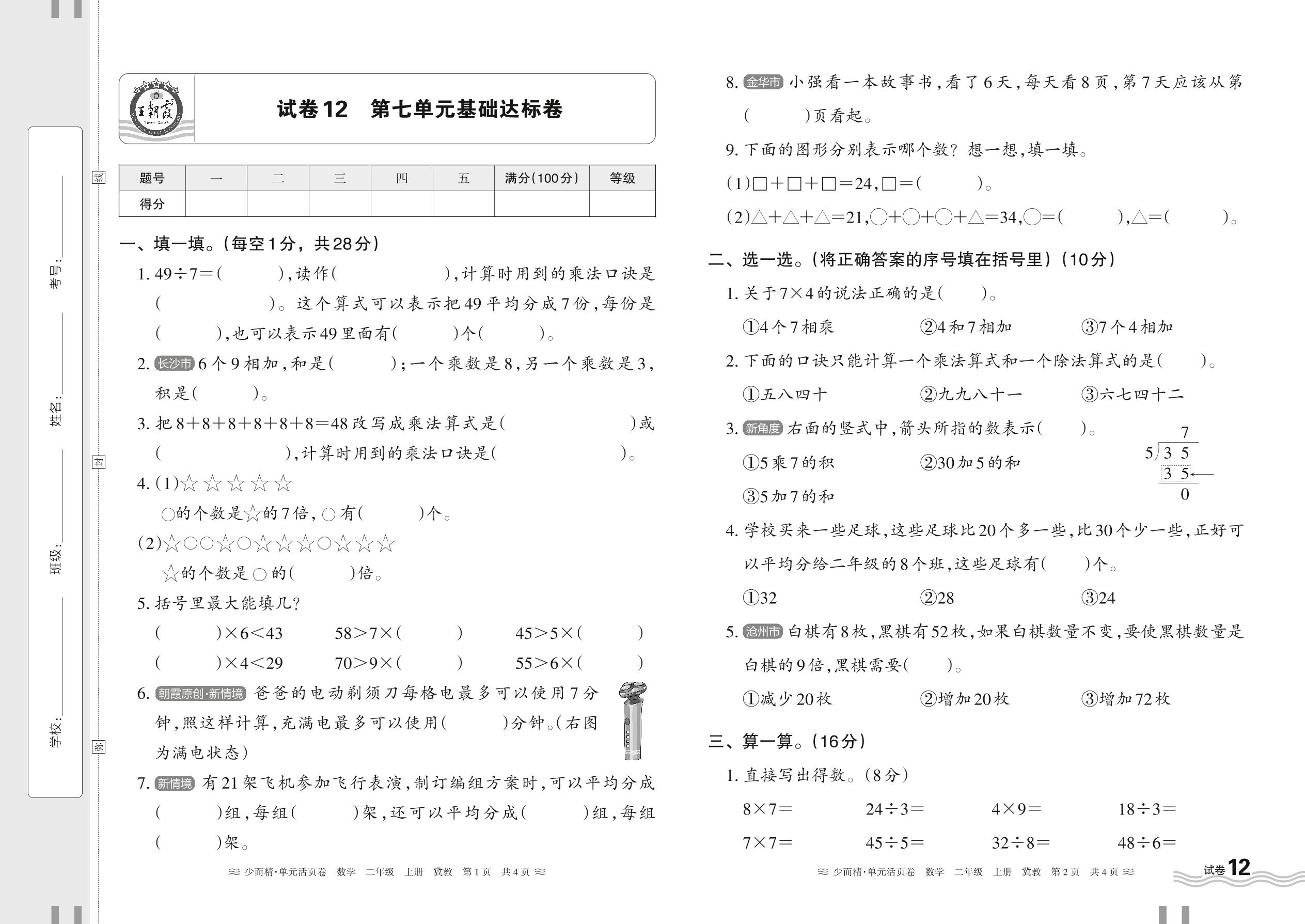 2024秋上册二年级数学冀教版 第七单元基础达标卷【12】