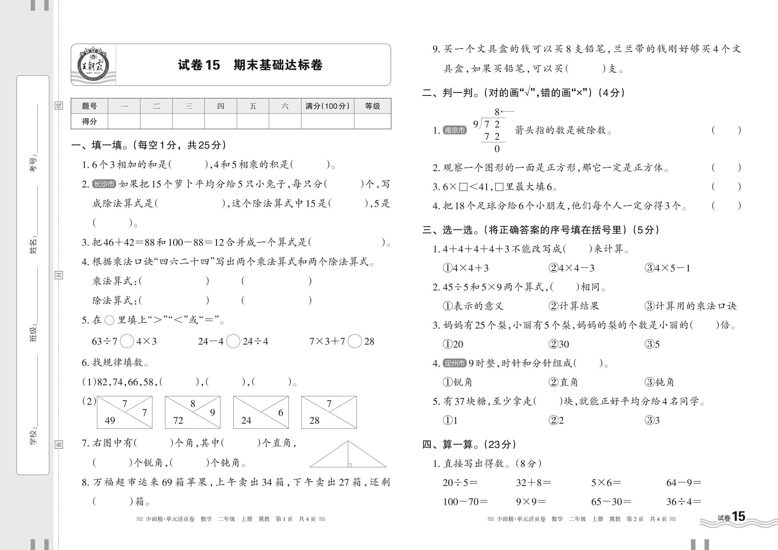 2024秋上册二年级数学冀教版 期末基础达标卷【15】