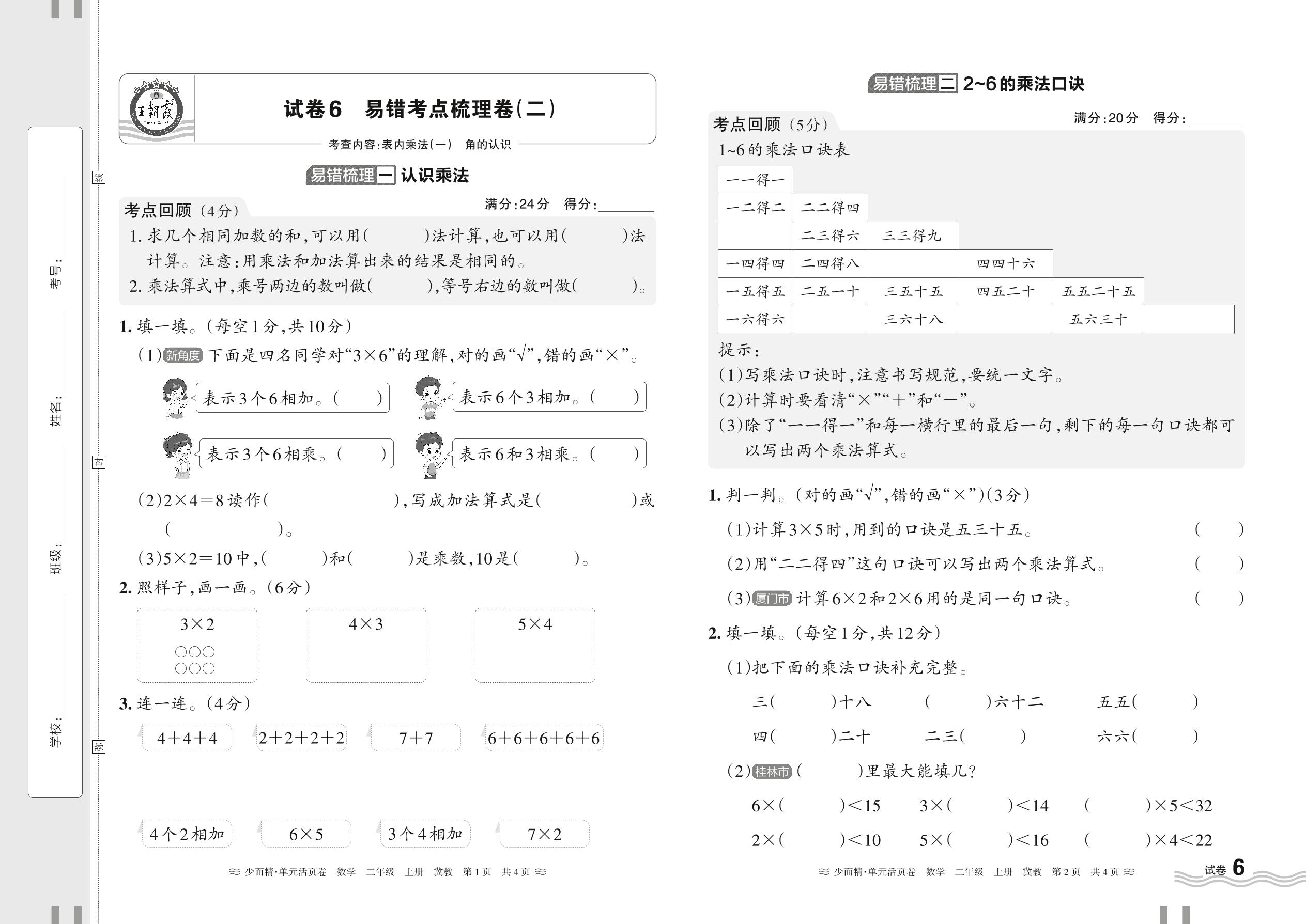2024秋上册二年级数学冀教版 易错考点梳理卷——表内乘法(一) 角的认识【6】