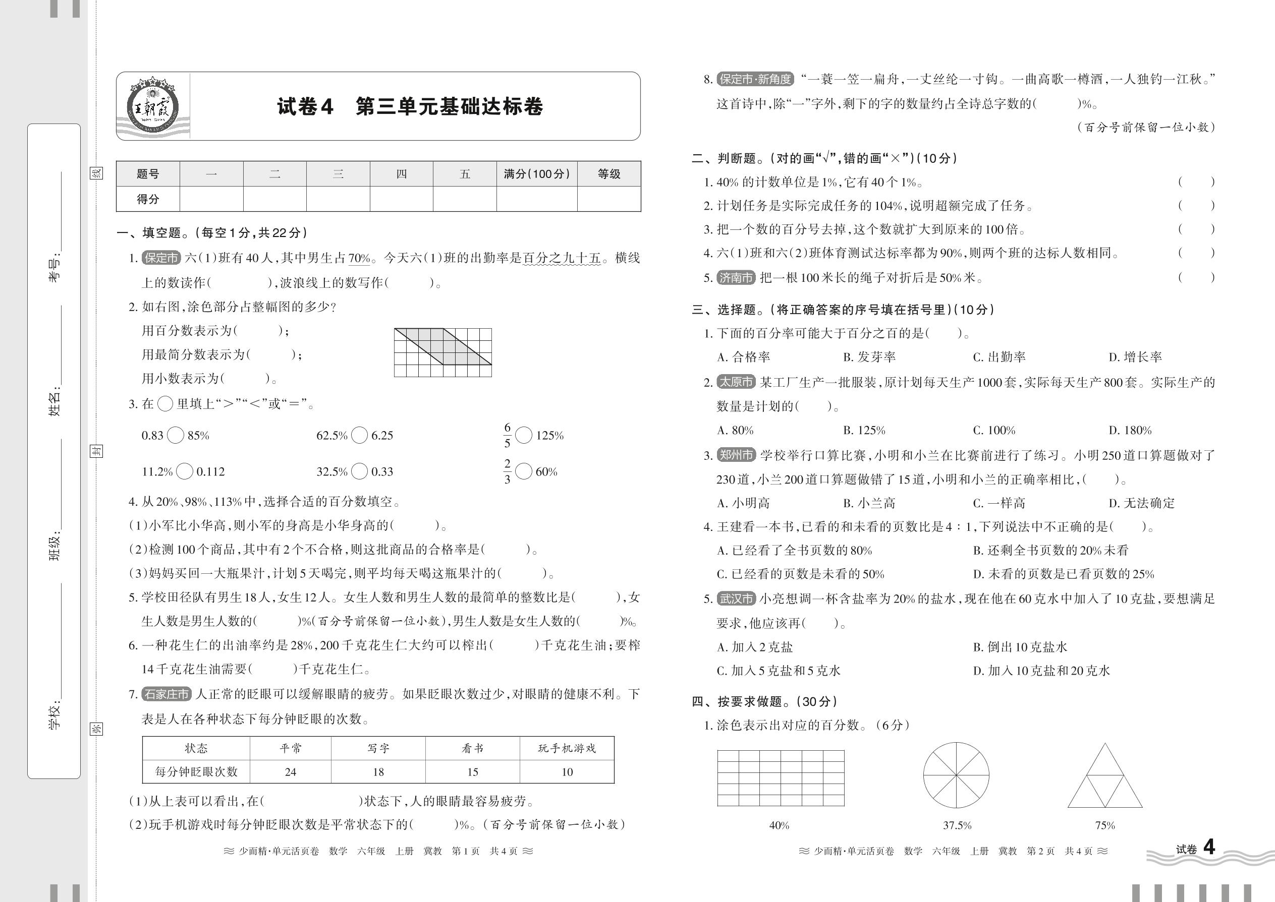 2024秋上册六年级数学冀教版 第三单元基础达标卷【4】