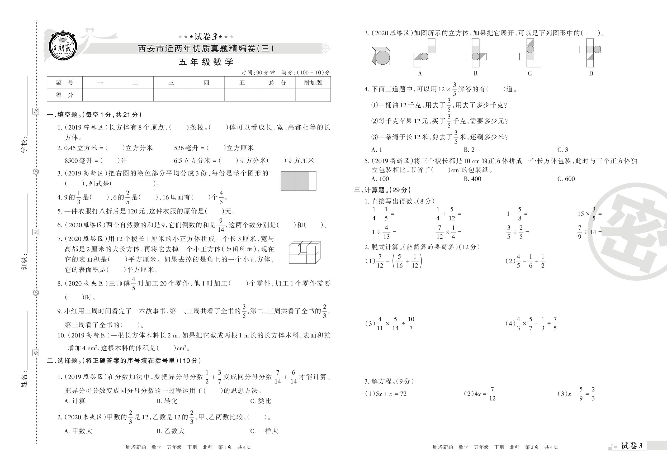 优质试题精编卷(三)五年级下册数学(北师版)【3】