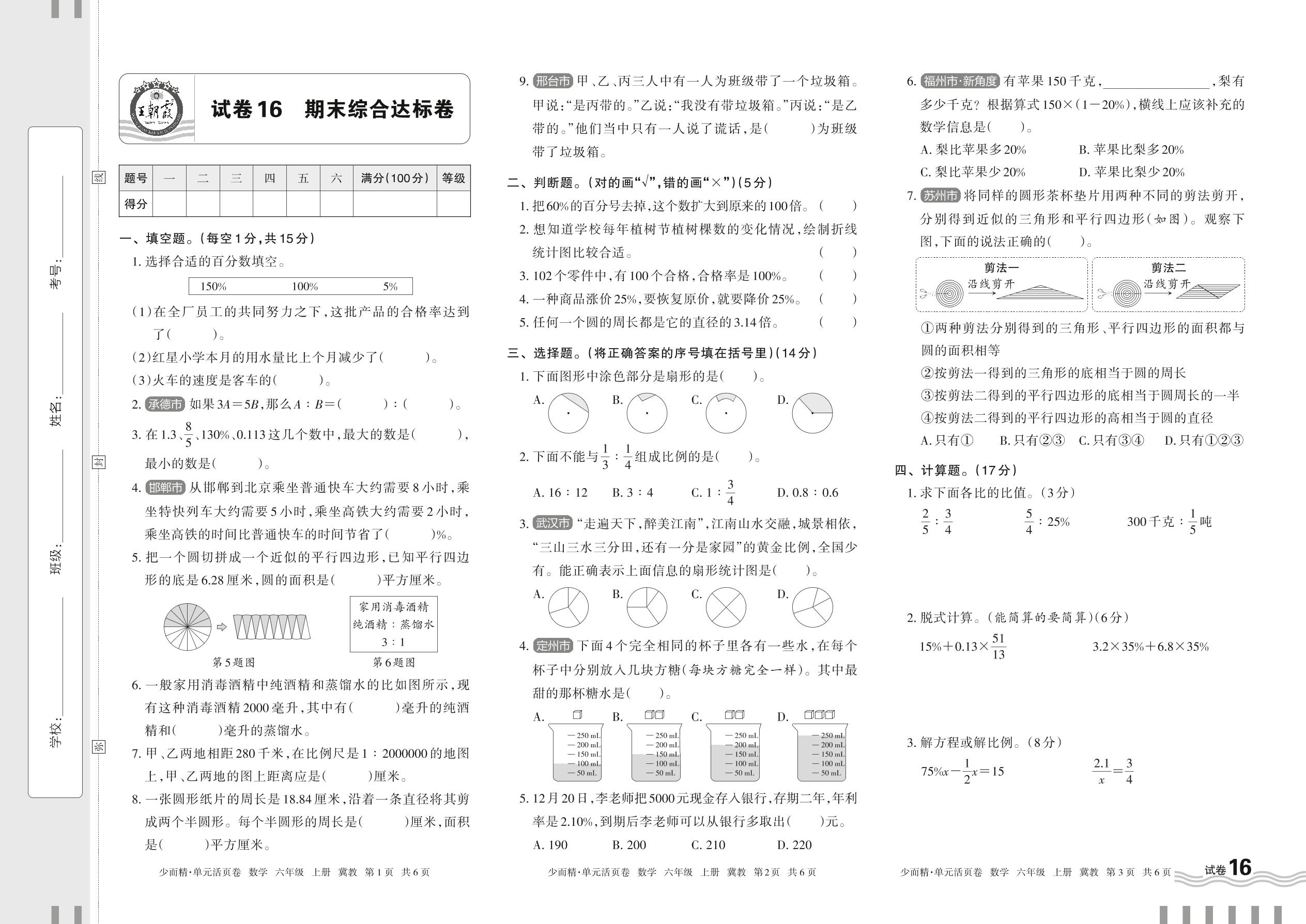 2024秋上册六年级数学冀教版 期末综合达标卷【16】