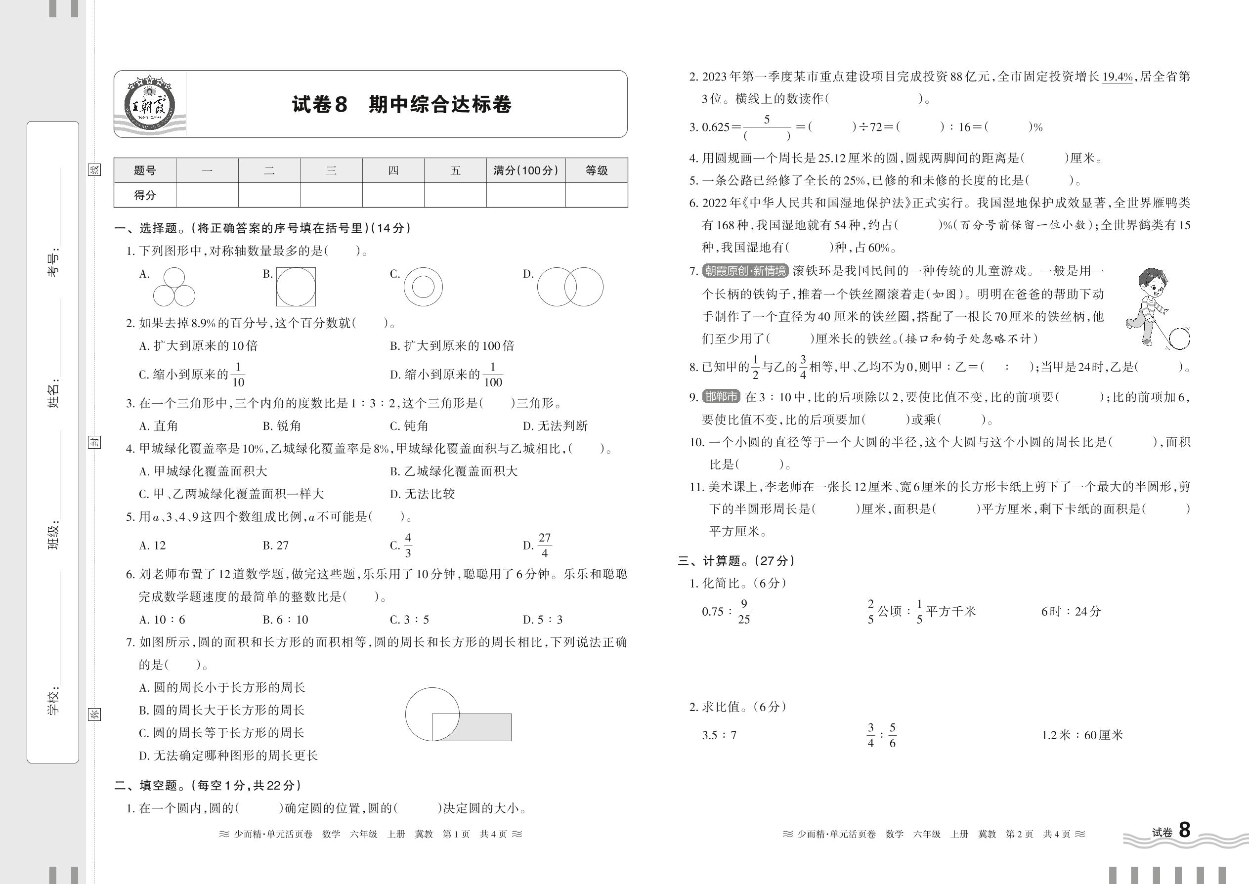 2024秋上册六年级数学冀教版 期中综合达标卷【8】