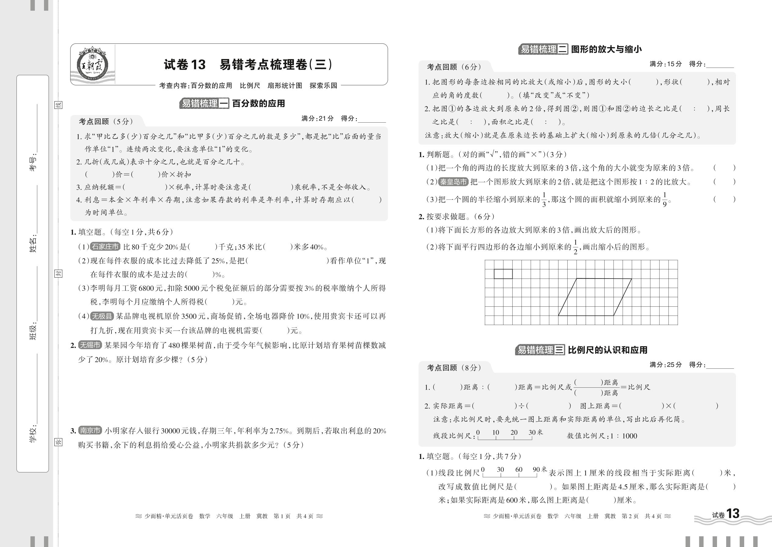 2024秋上册六年级数学冀教版 易错考点梳理卷——百分数的应用 比例尺 扇形统计图 探索乐园【13】