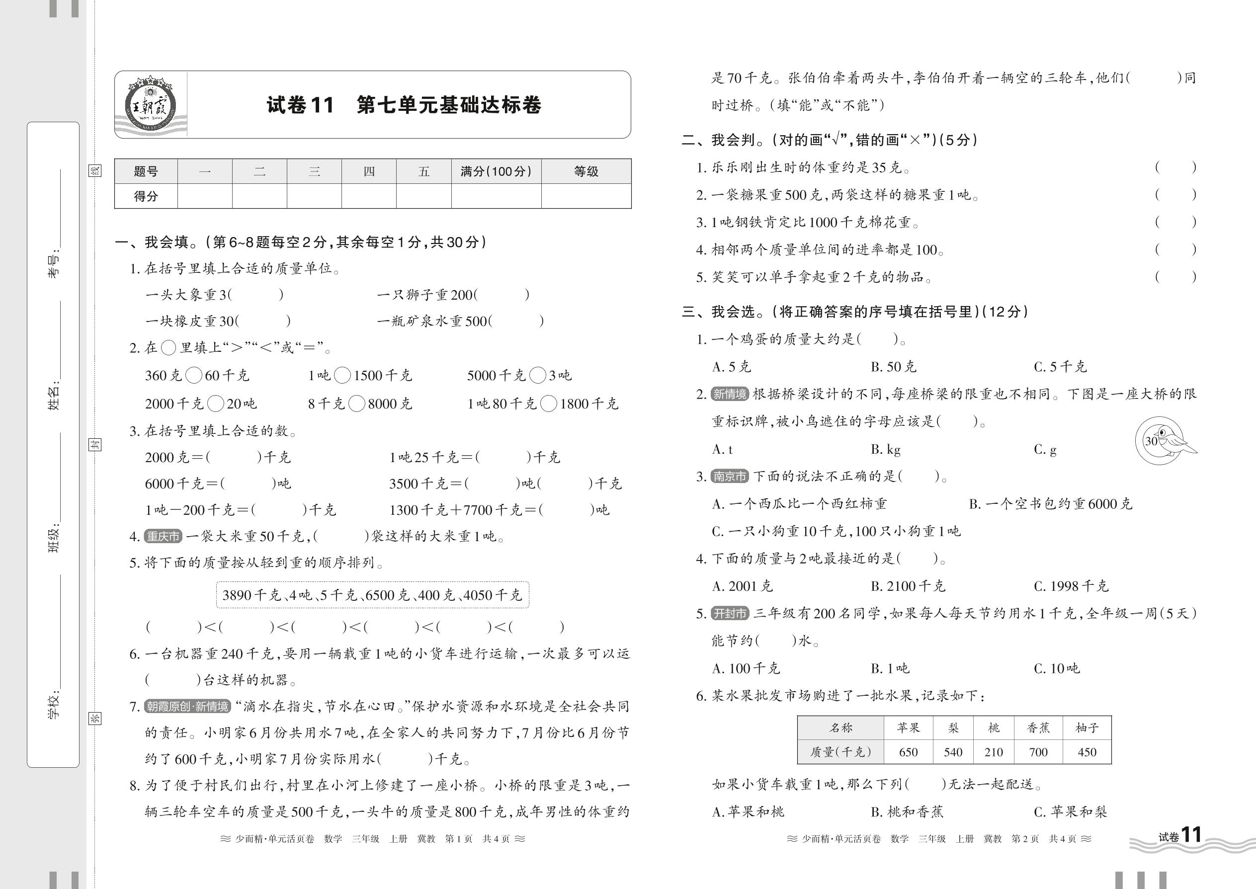 2024秋上册三年级数学冀教版 第七单元基础达标卷【11】