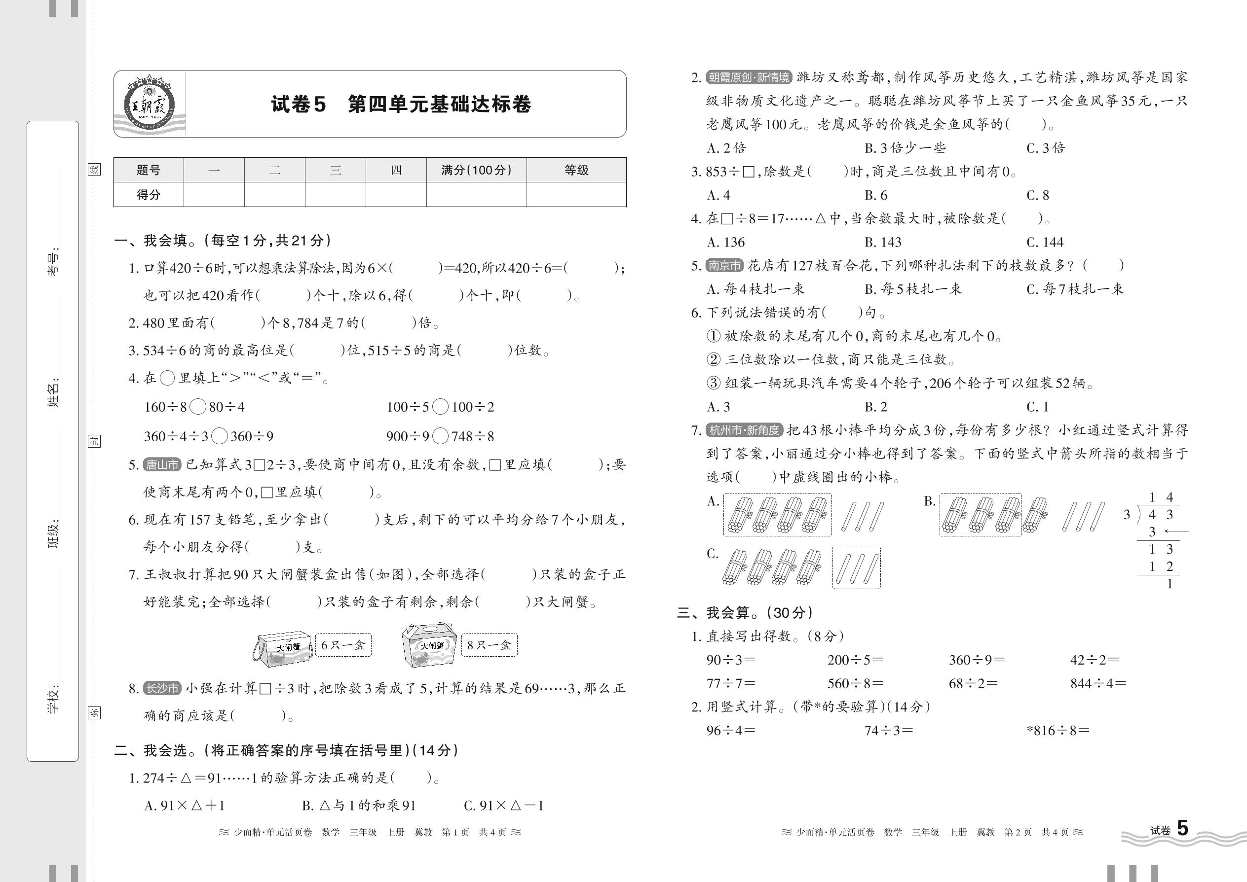 2024秋上册三年级数学冀教版 第四单元基础达标卷【5】