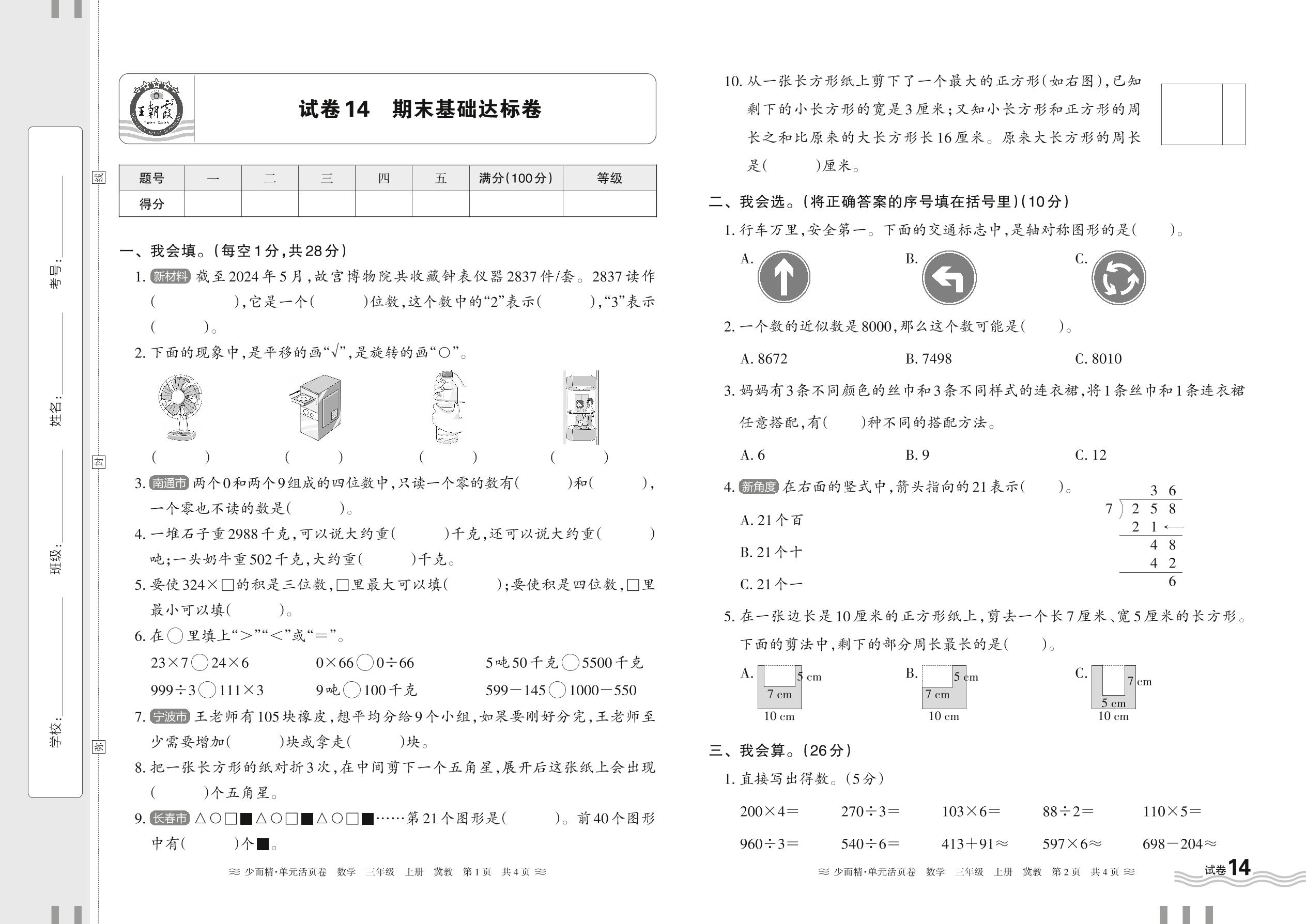 2024秋上册三年级数学冀教版 期末基础达标卷【14】