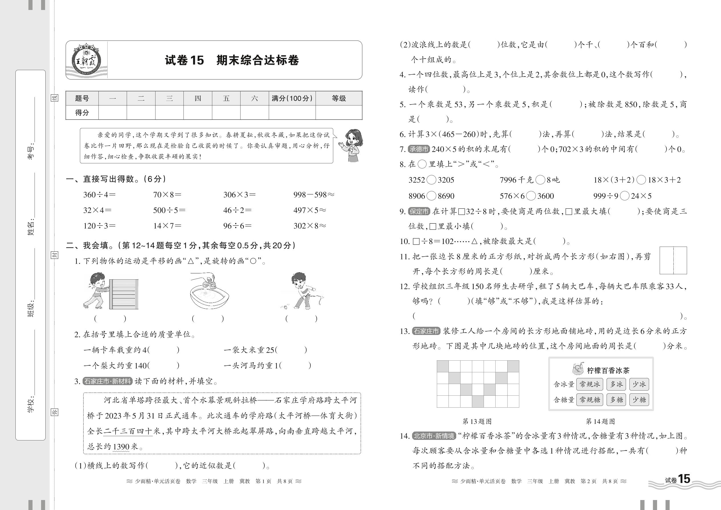 2024秋上册三年级数学冀教版 期末综合达标卷【15】