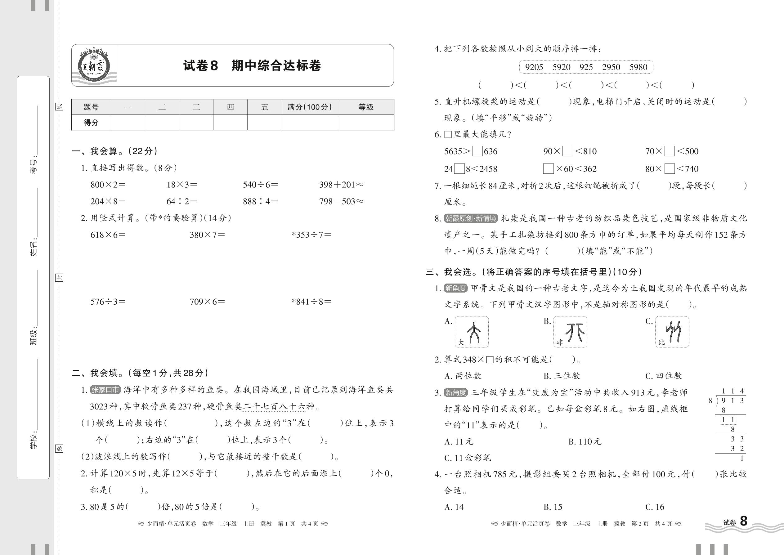 2024秋上册三年级数学冀教版 期中综合达标卷【8】
