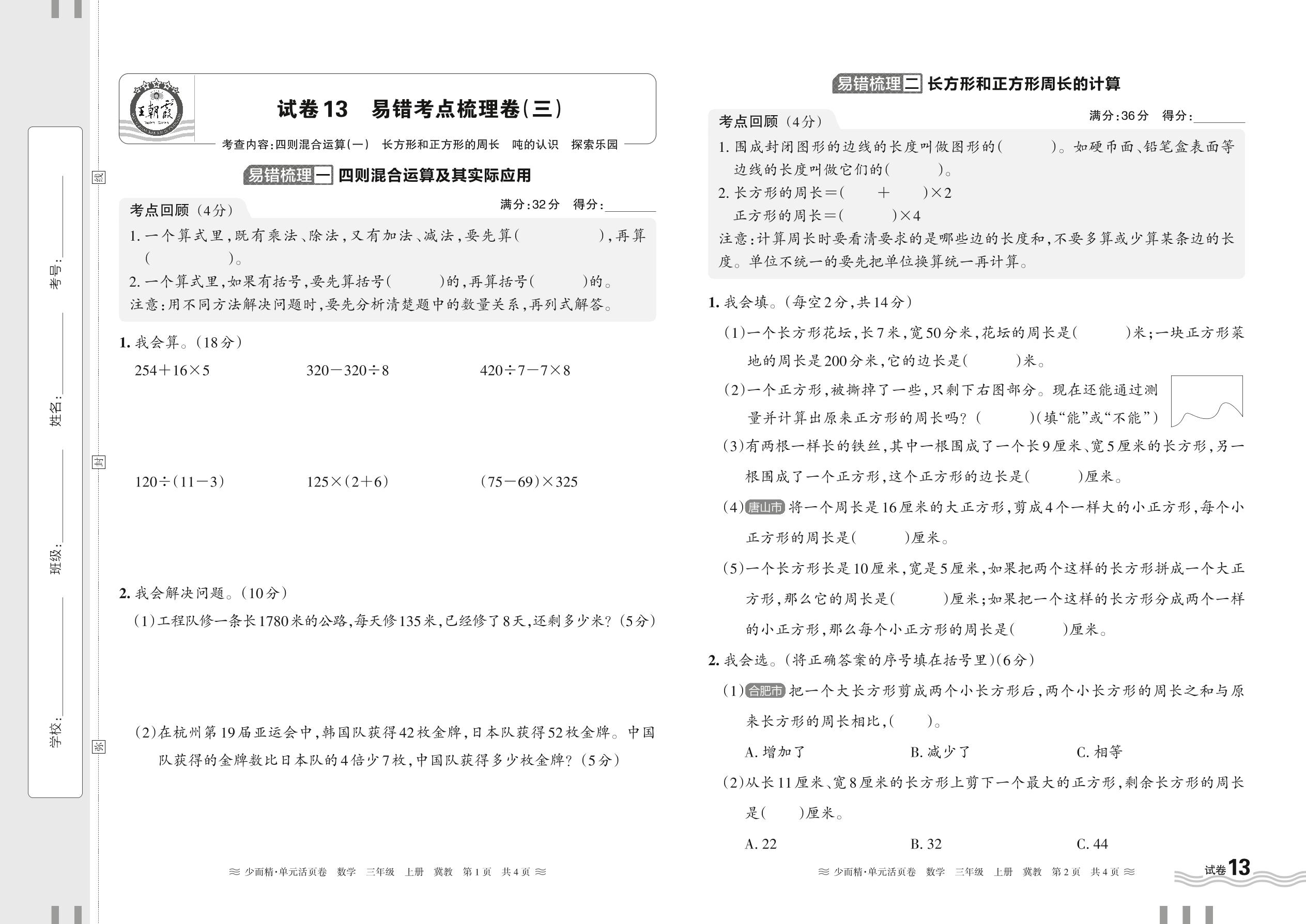 2024秋上册三年级数学冀教版 易错考点梳理卷——四则混合运算(一) 长方形和正方形的周长 吨的认识 探索乐园【13】