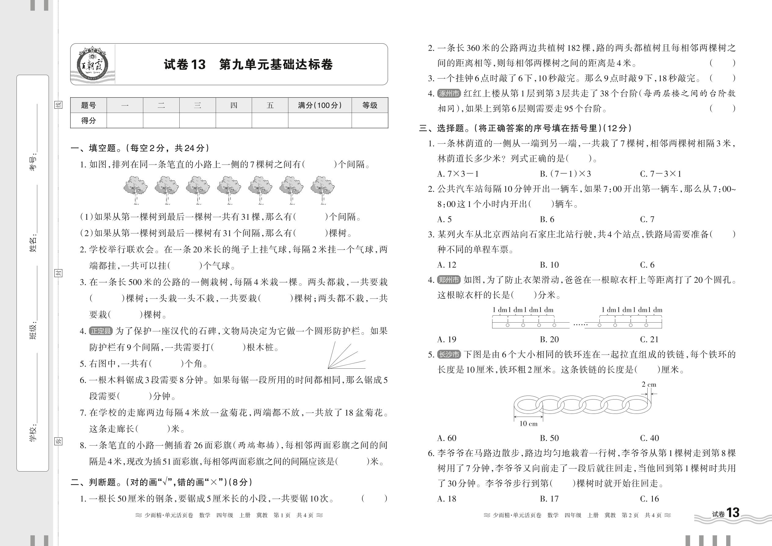 2024秋上册四年级数学冀教版 第九单元基础达标卷【13】