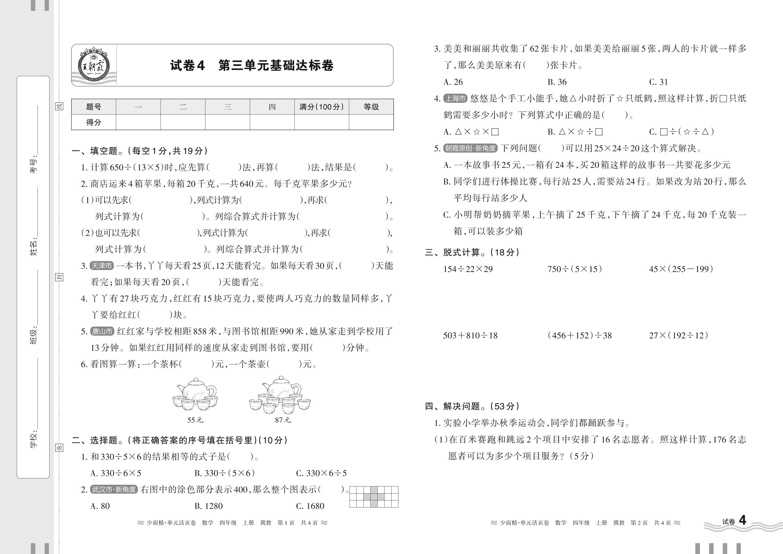 2024秋上册四年级数学冀教版 第三单元基础达标卷【4】