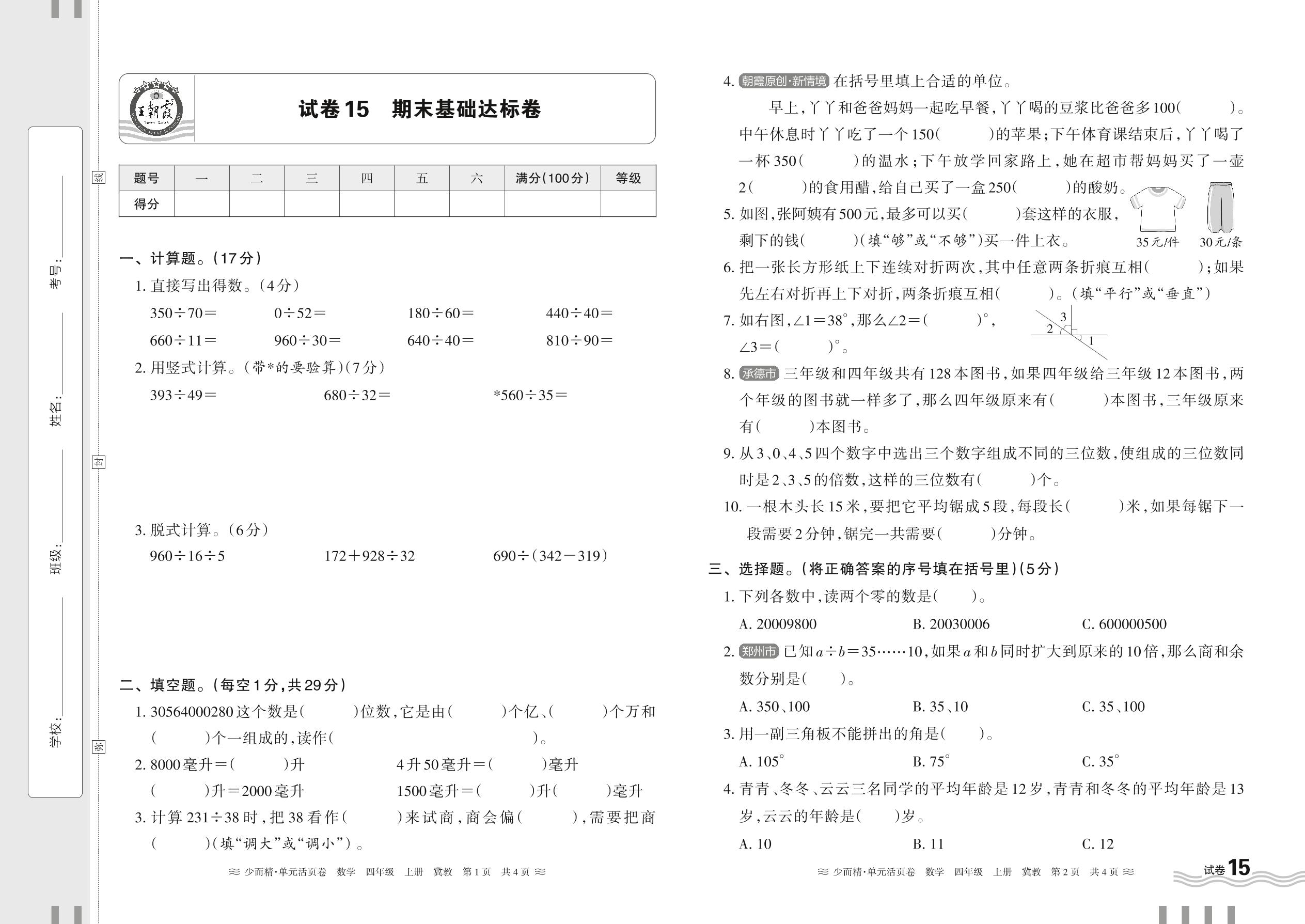 2024秋上册四年级数学冀教版 期末基础达标卷【15】