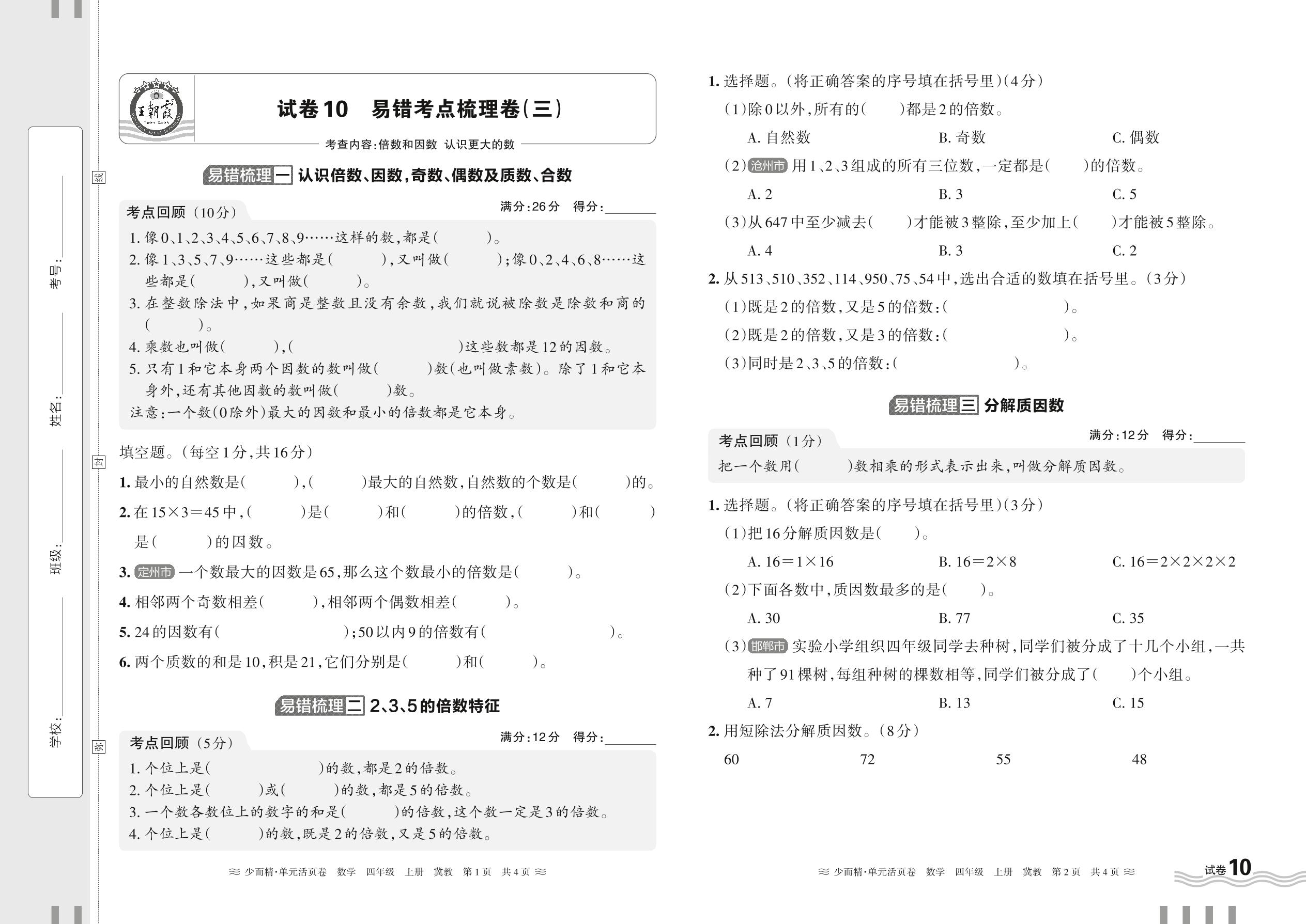 2024秋上册四年级数学冀教版 易错考点梳理卷——倍数和因数 认识更大的数【10】