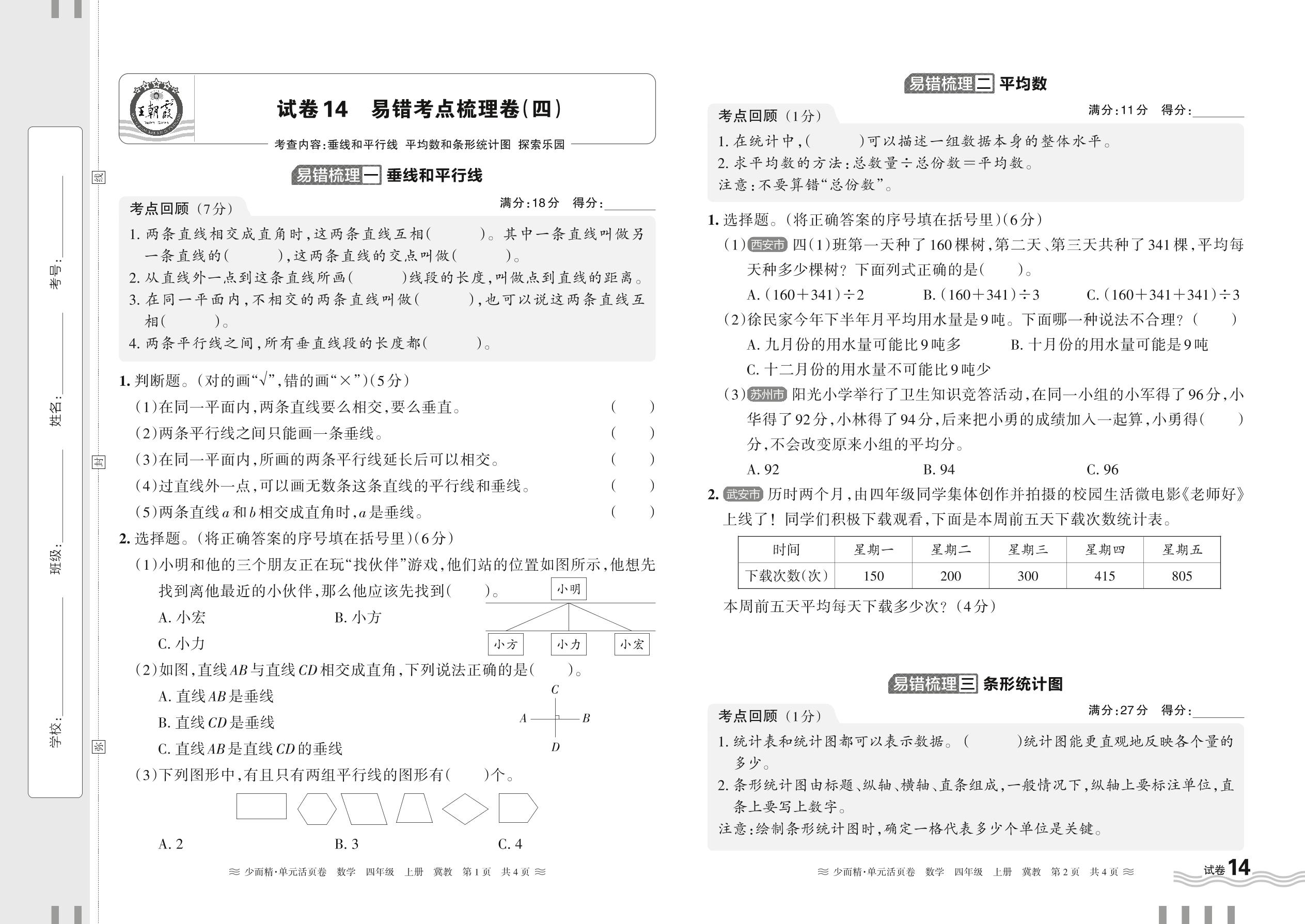 2024秋上册四年级数学冀教版 易错考点梳理卷——垂线和平行线 平均数和条形统计图 探索乐园【14】