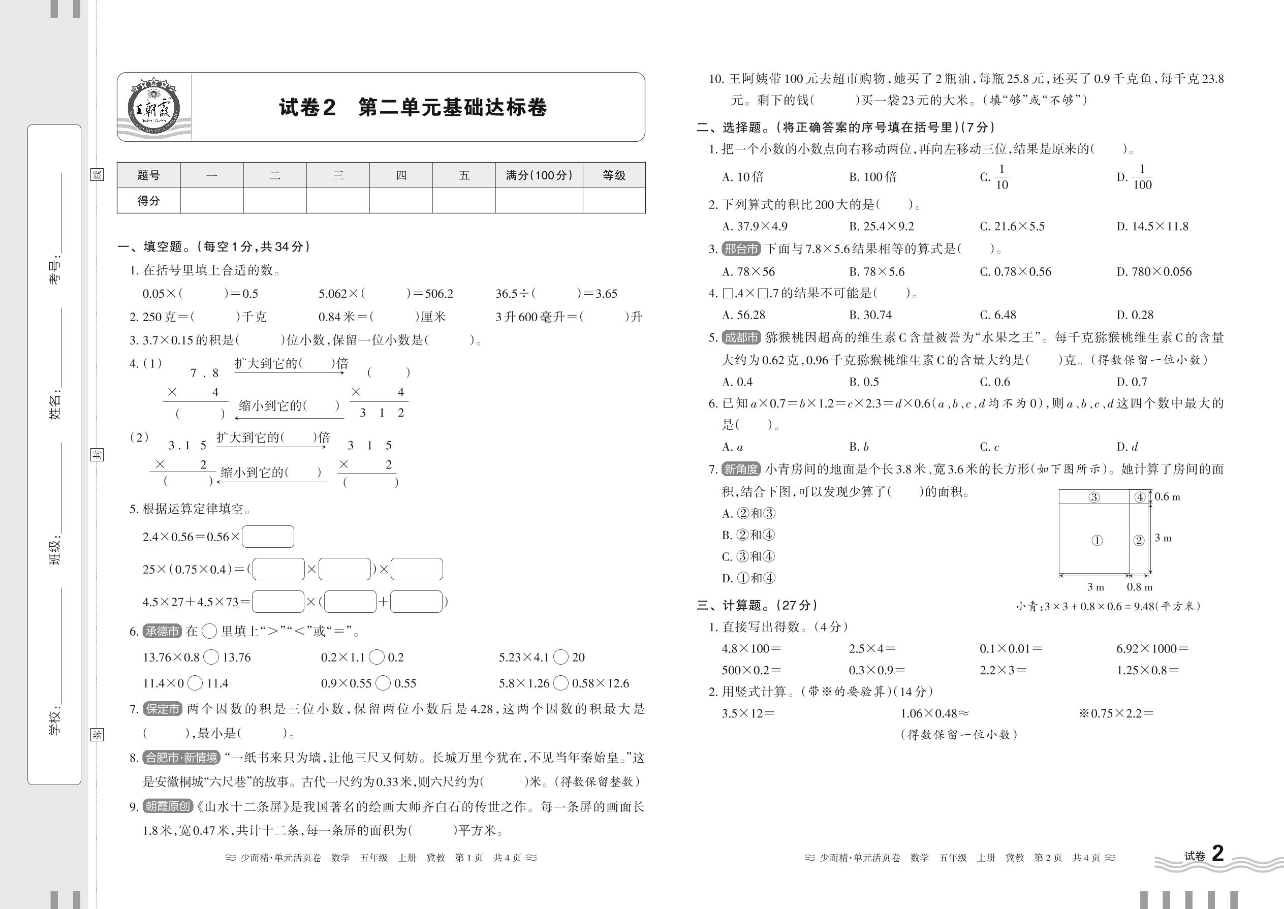 2024秋上册五年级数学冀教版 第二单元基础达标卷【2】