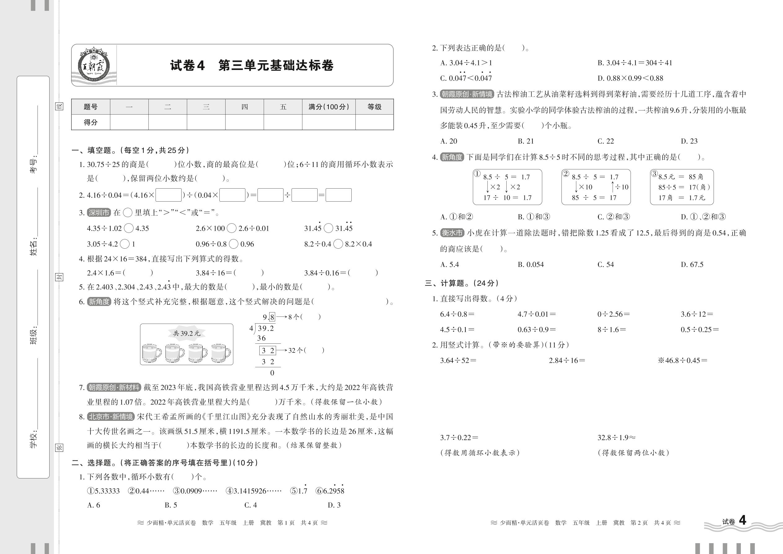 2024秋上册五年级数学冀教版 第三单元基础达标卷【4】