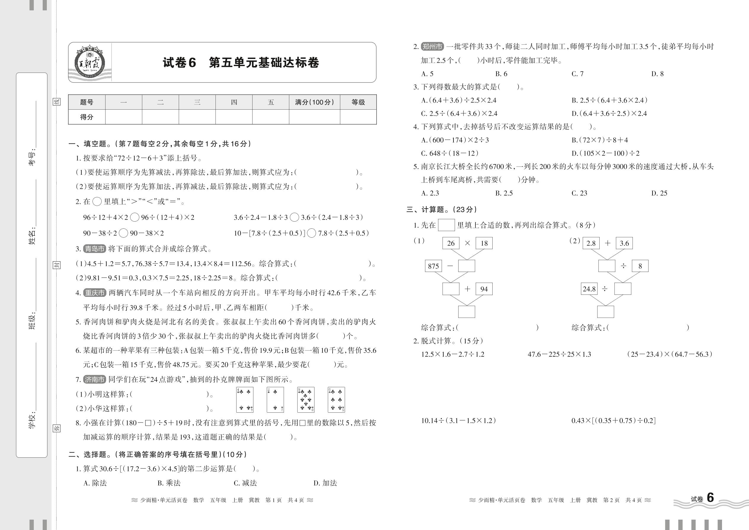 2024秋上册五年级数学冀教版 第五单元基础达标卷【6】