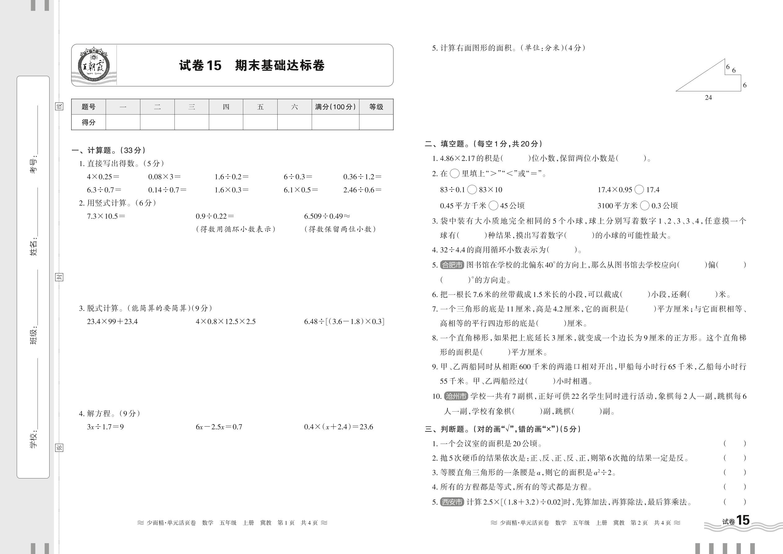 2024秋上册五年级数学冀教版 期末基础达标卷【15】