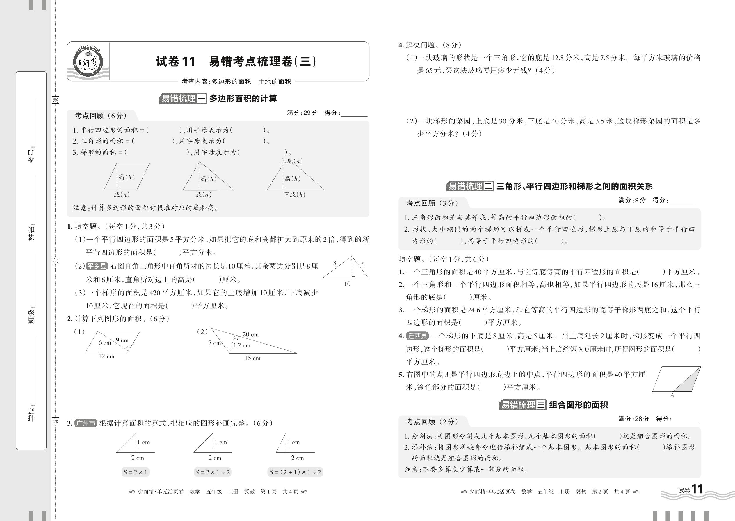 2024秋上册五年级数学冀教版 易错考点梳理卷——多边形的面积 土地的面积【11】