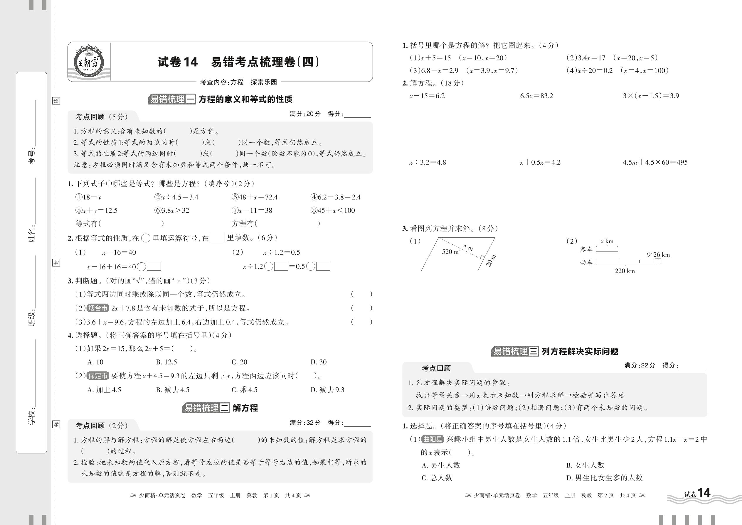 2024秋上册五年级数学冀教版 易错考点梳理卷——方程 探索乐园【14】