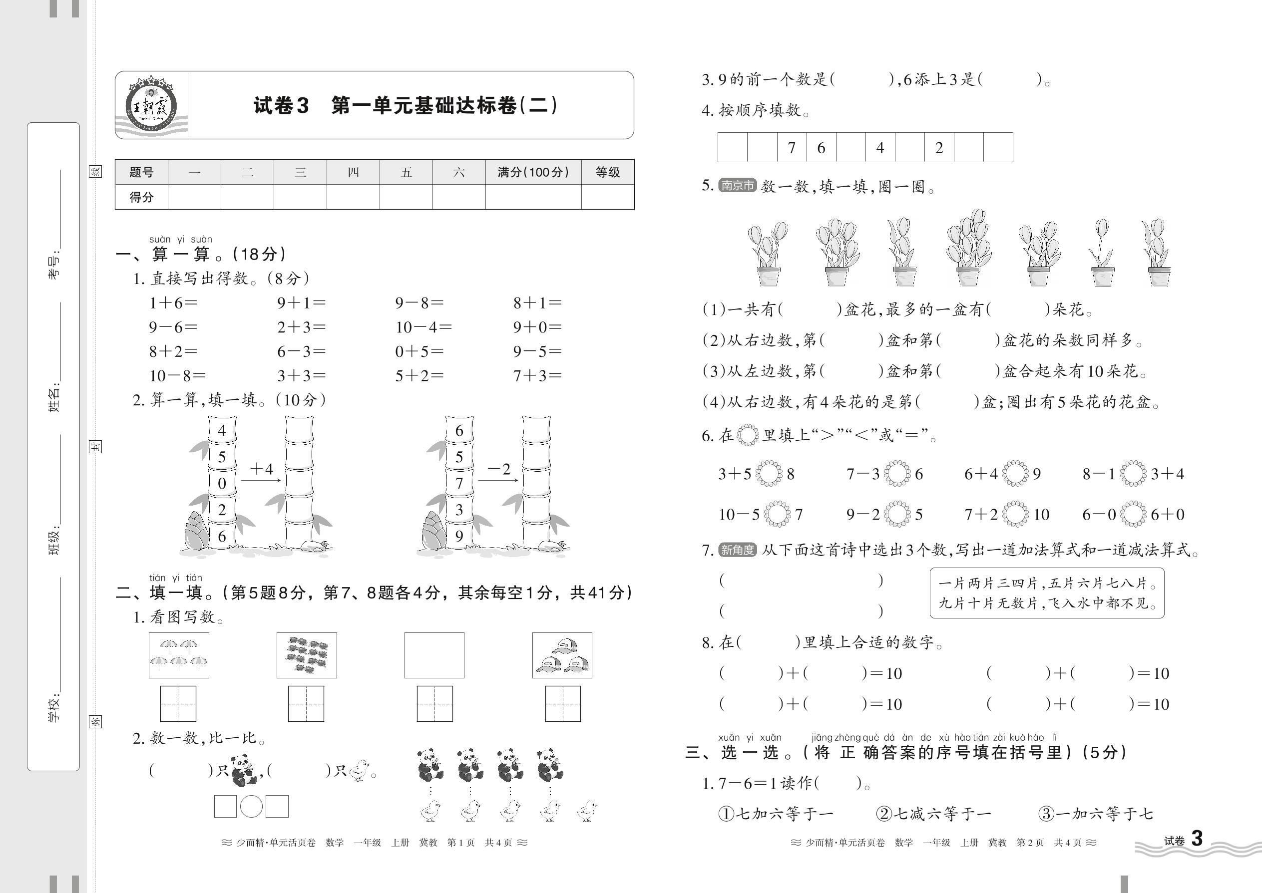 2024秋上册一年级数学冀教版 第一单元基础达标卷(二)【3】