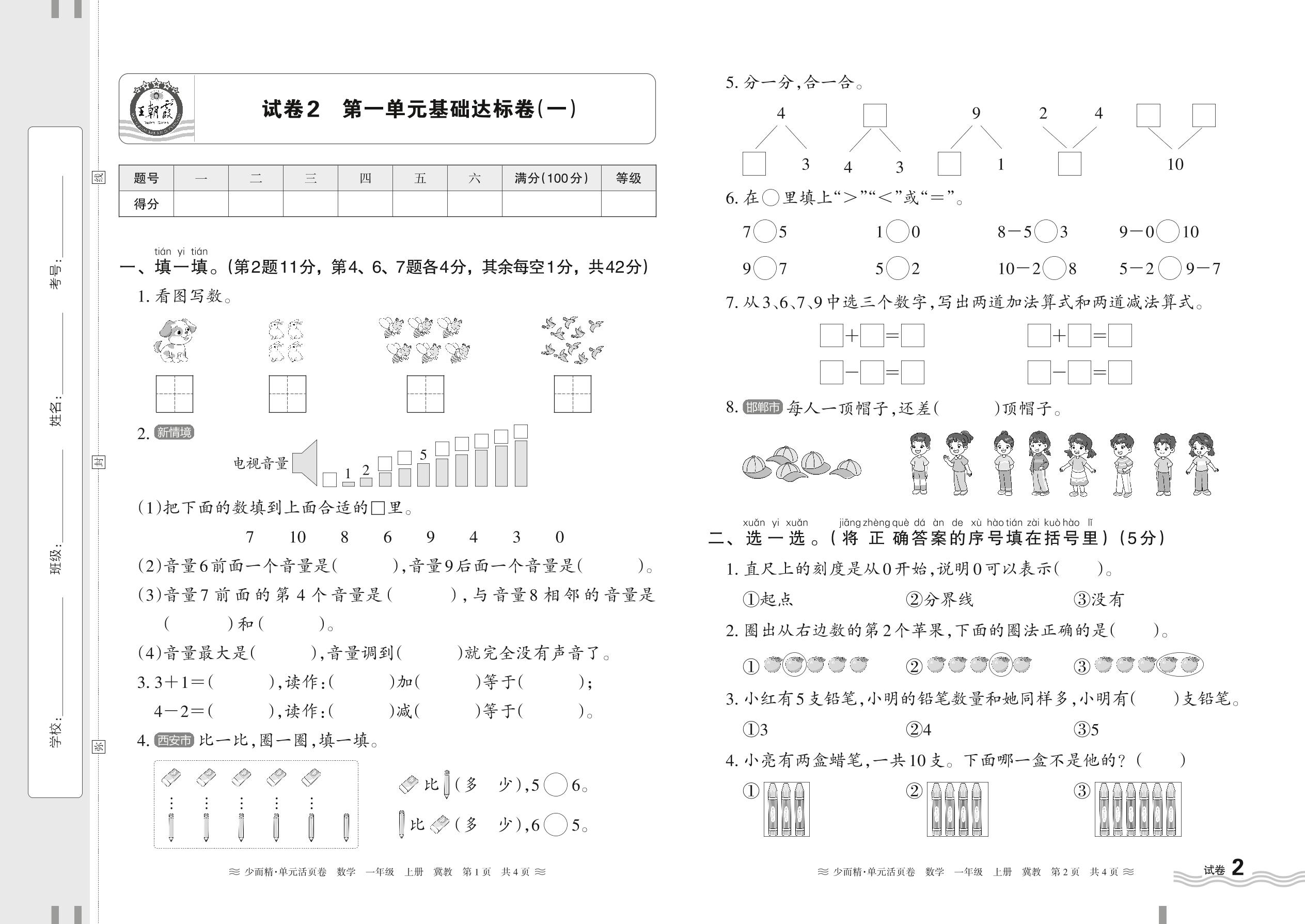 2024秋上册一年级数学冀教版 第一单元基础达标卷(一)【2】