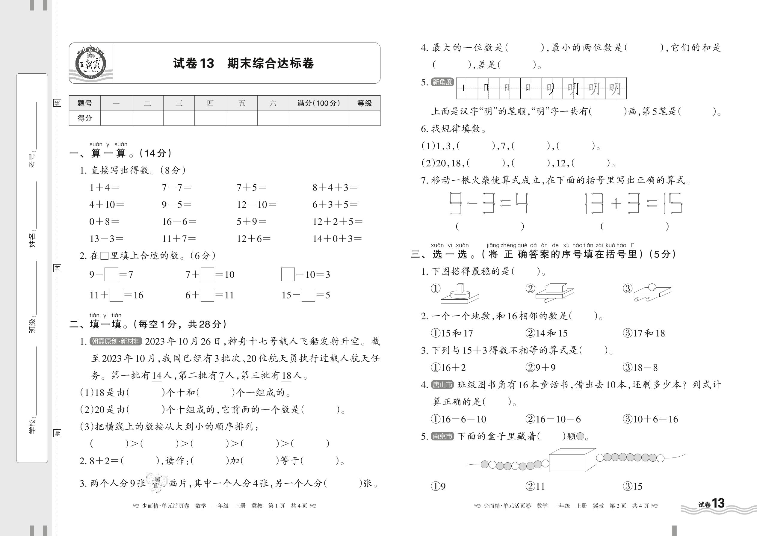 2024秋上册一年级数学冀教版 期末综合达标卷【13】