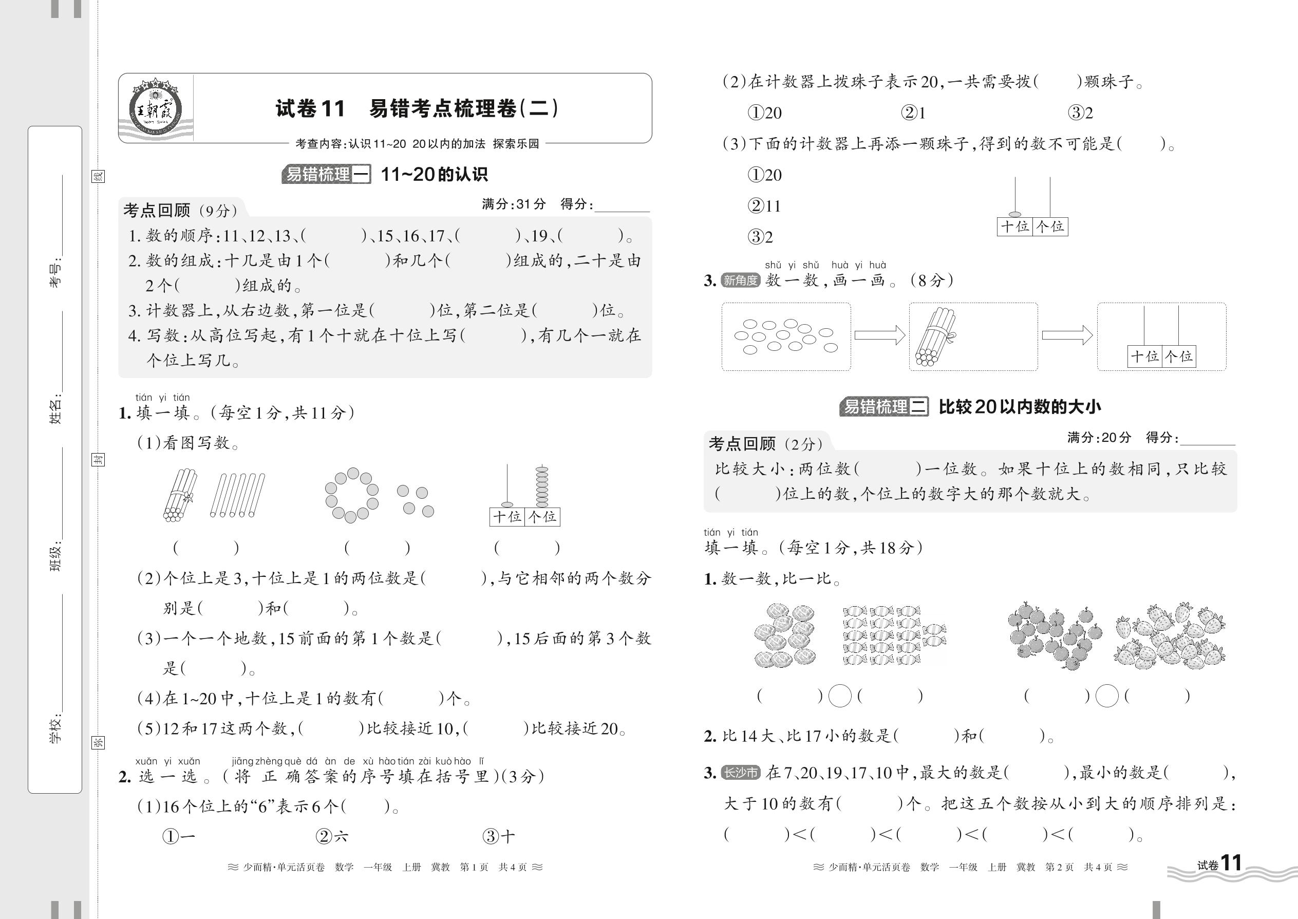 2024秋上册一年级数学冀教版 易错考点梳理卷——认识11~20 20以内的加法 探索乐园【11】