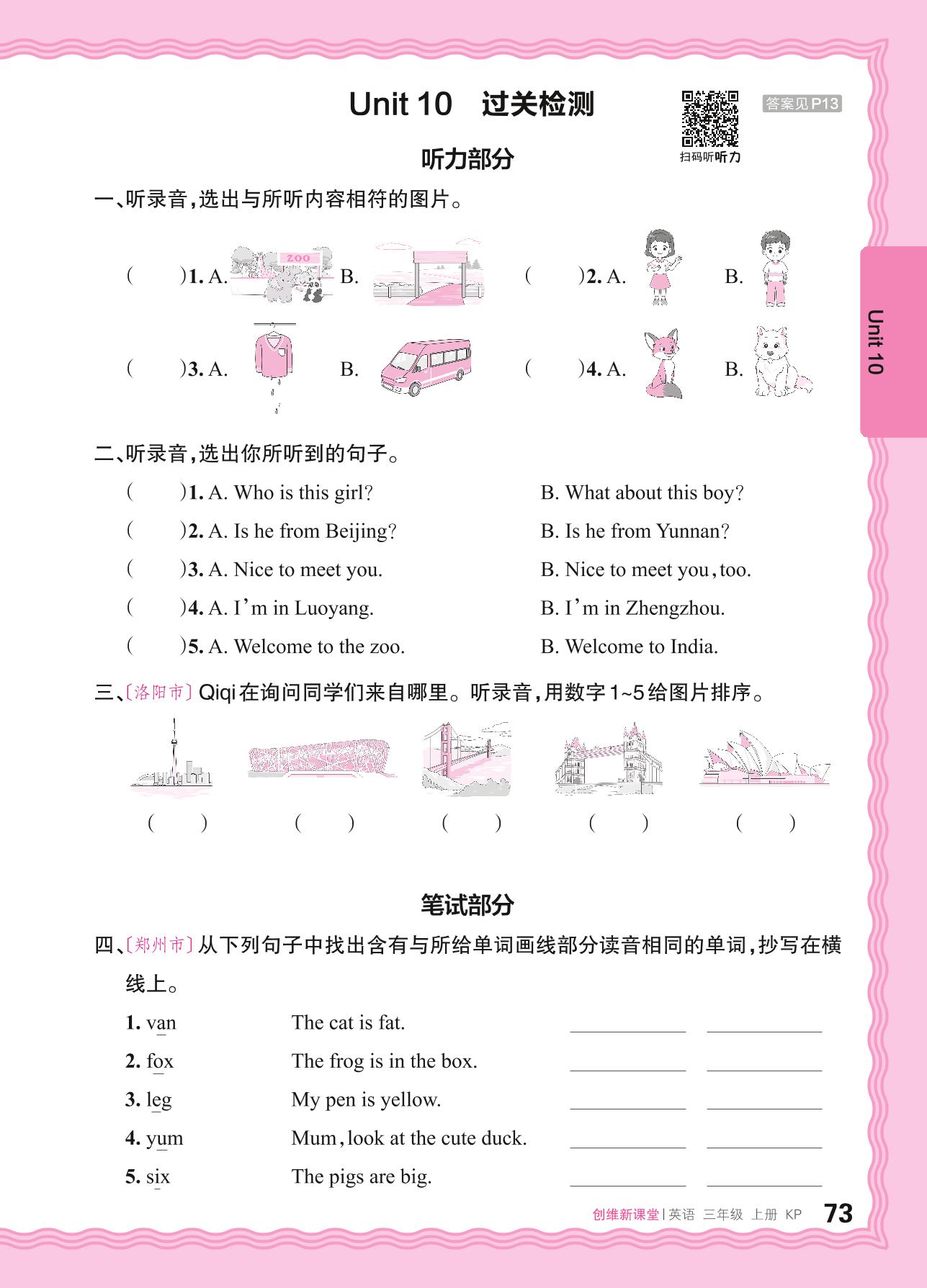 2024秋上册三年级英语科普版 Unit 10 过关检测