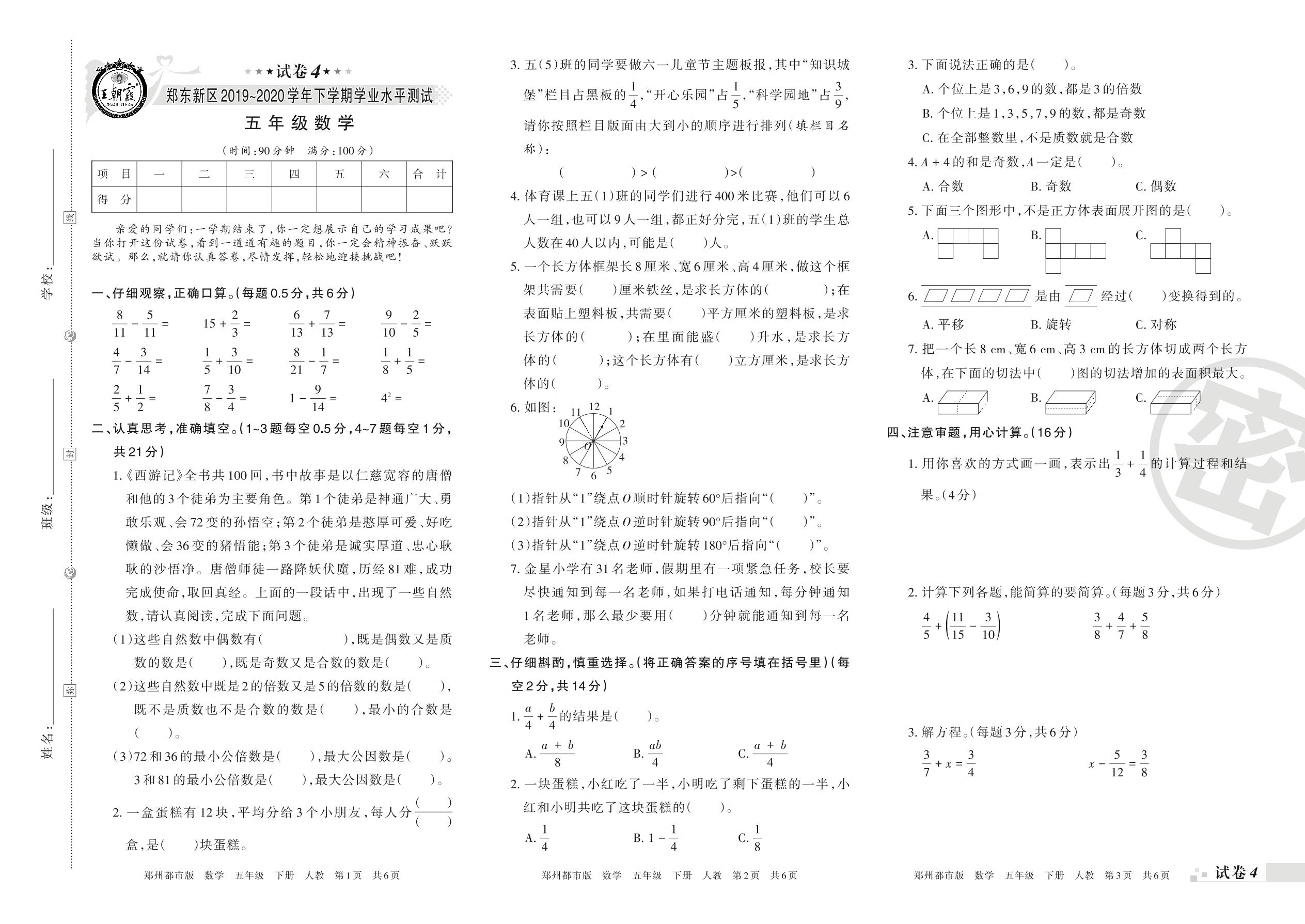 2019-2020学年第二学期郑州市郑东新区五年级数学试卷(人教版)【4】