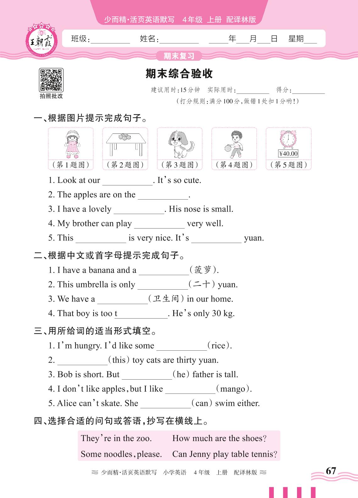 2024秋上册四年级英语译林版(三起始) 期末综合验收(默写专练)