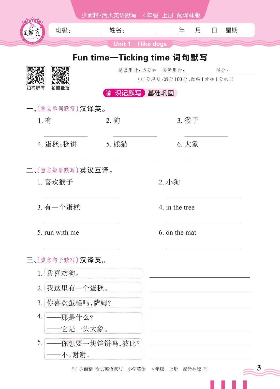 2024秋上册四年级英语译林版(三起始) Unit 1 Fun time—Ticking time 词句默写