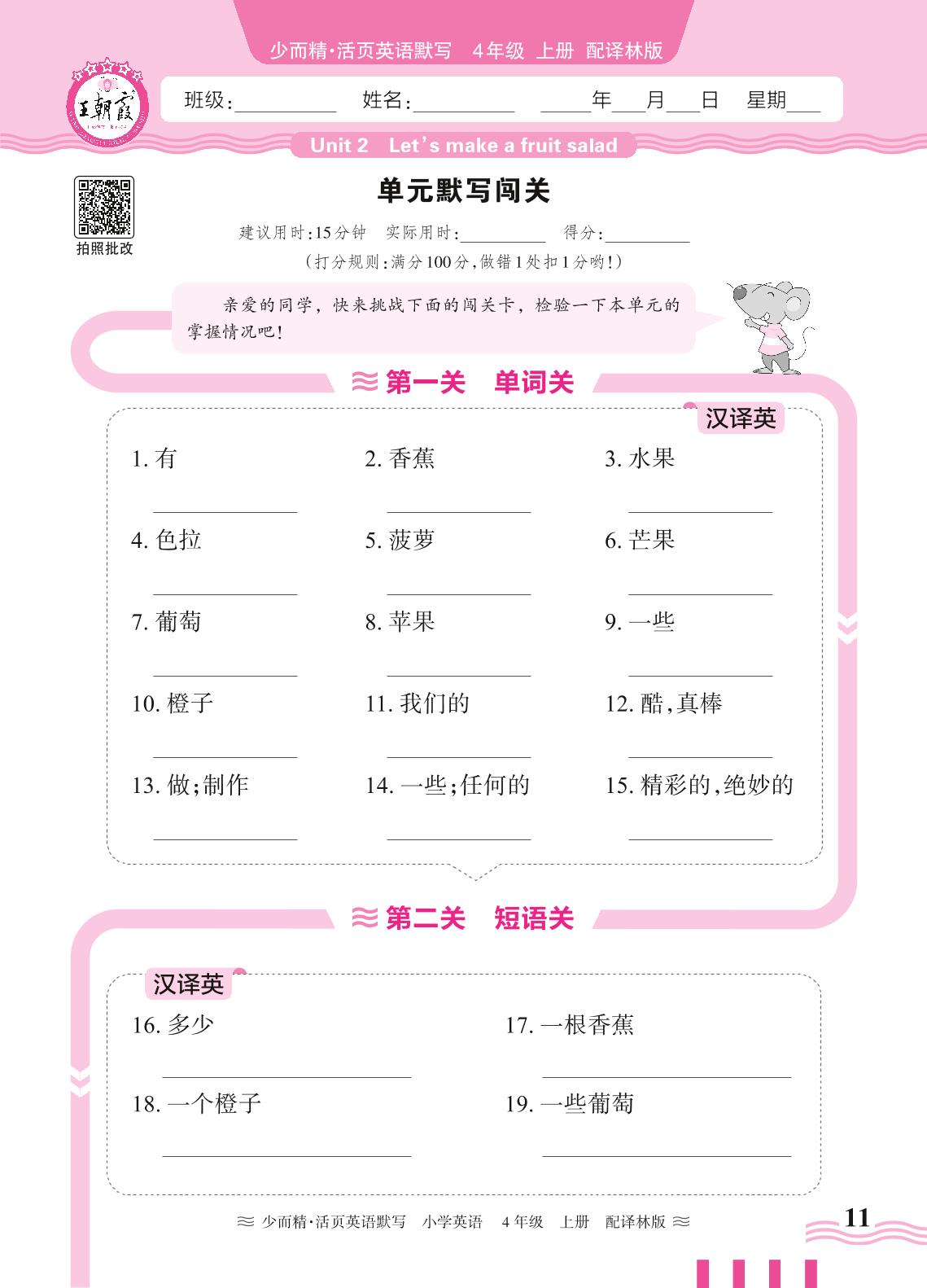 2024秋上册四年级英语译林版(三起始) Unit 2 单元默写闯关
