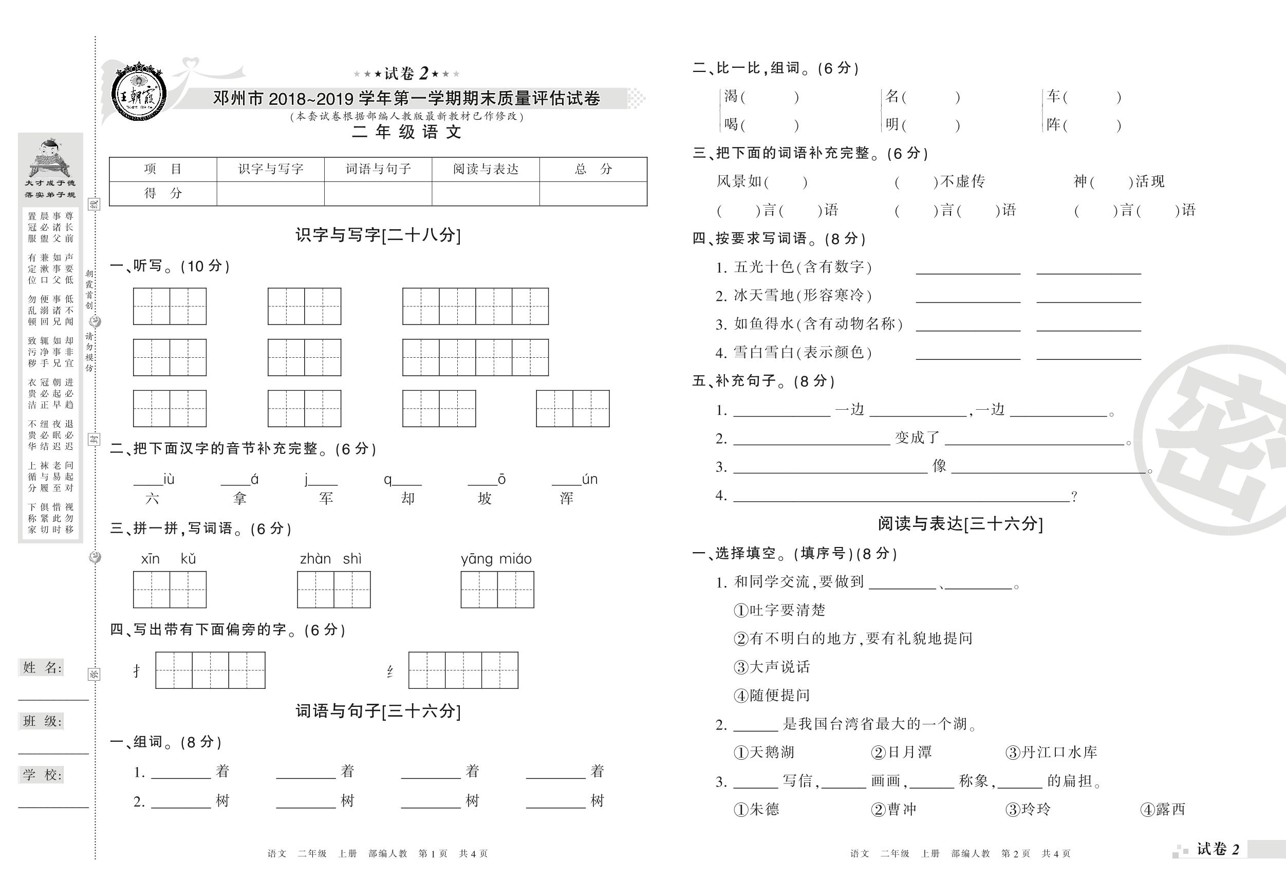 2018-2019学年第一学期邓州市二年级语文试卷(人教版)【2】