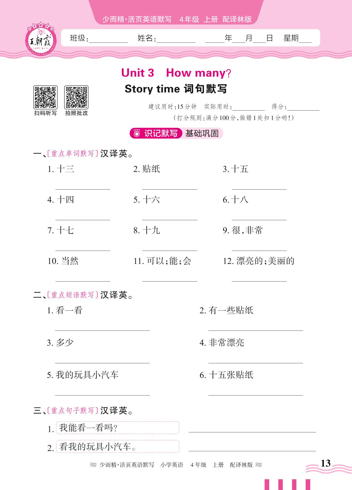 2024秋上册四年级英语译林版(三起始) Unit 3 Story time 词句默写