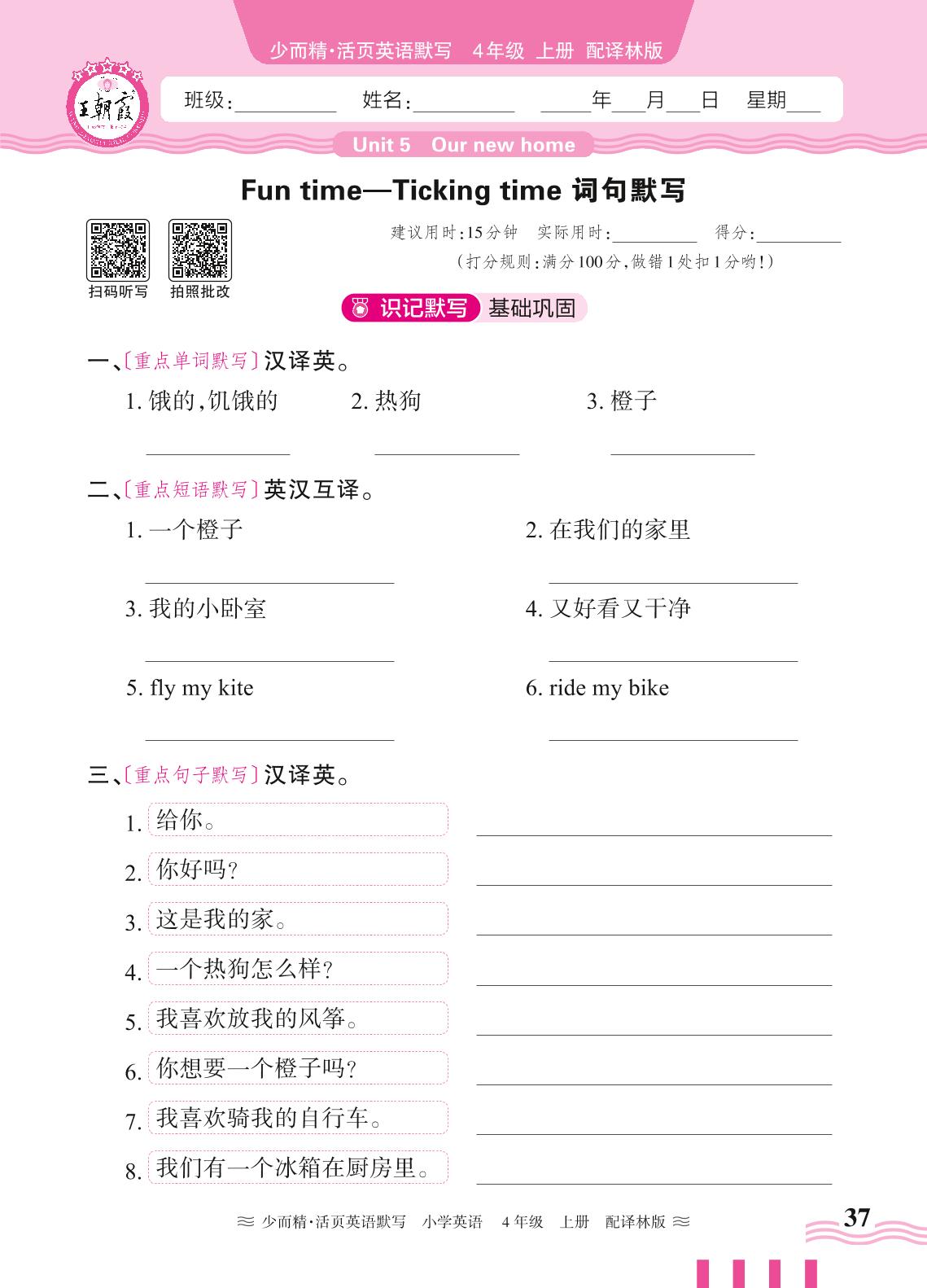 2024秋上册四年级英语译林版(三起始) Unit 5 Fun time—Ticking time 词句默写