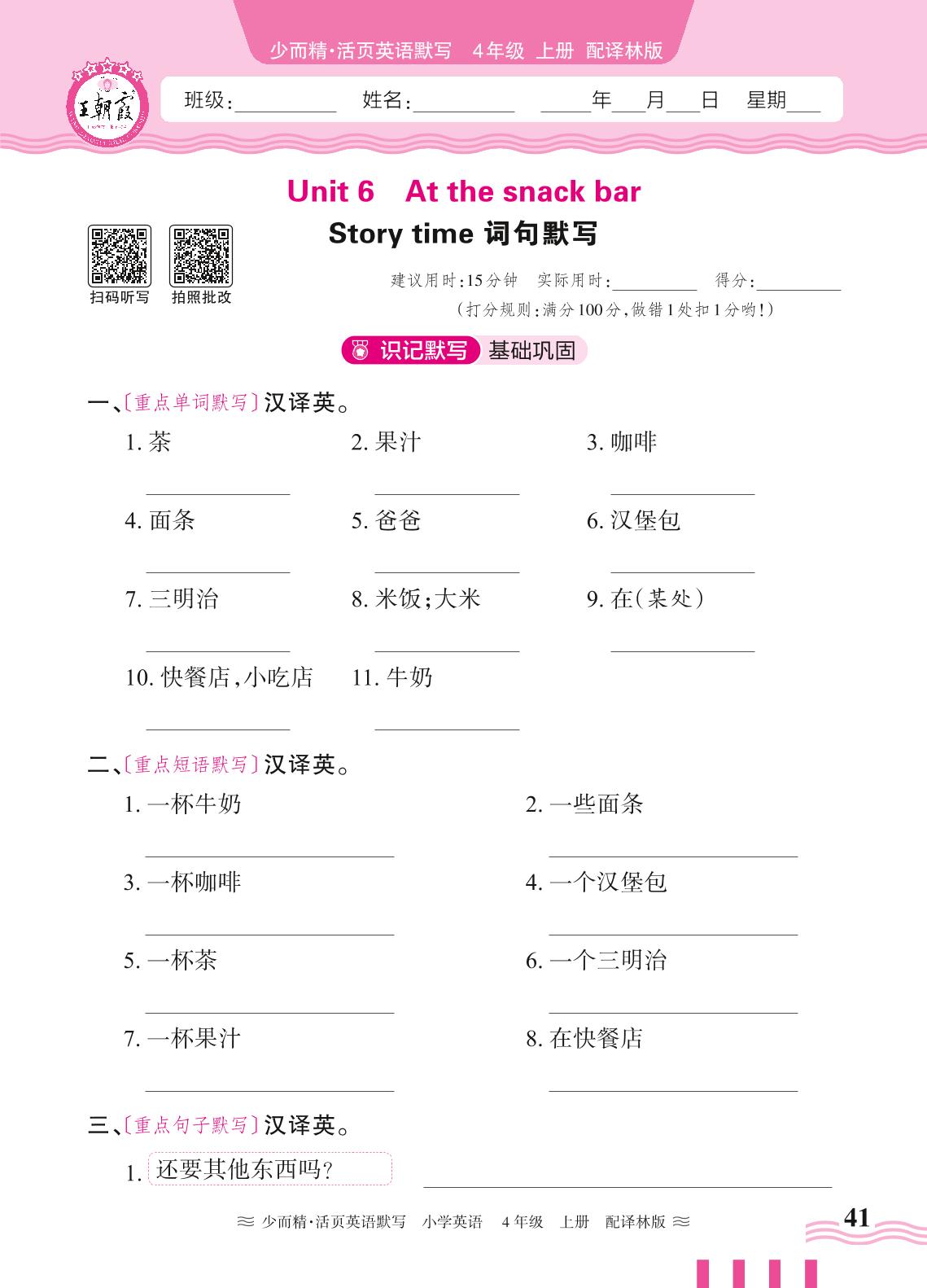 2024秋上册四年级英语译林版(三起始) Unit 6 Story time 词句默写