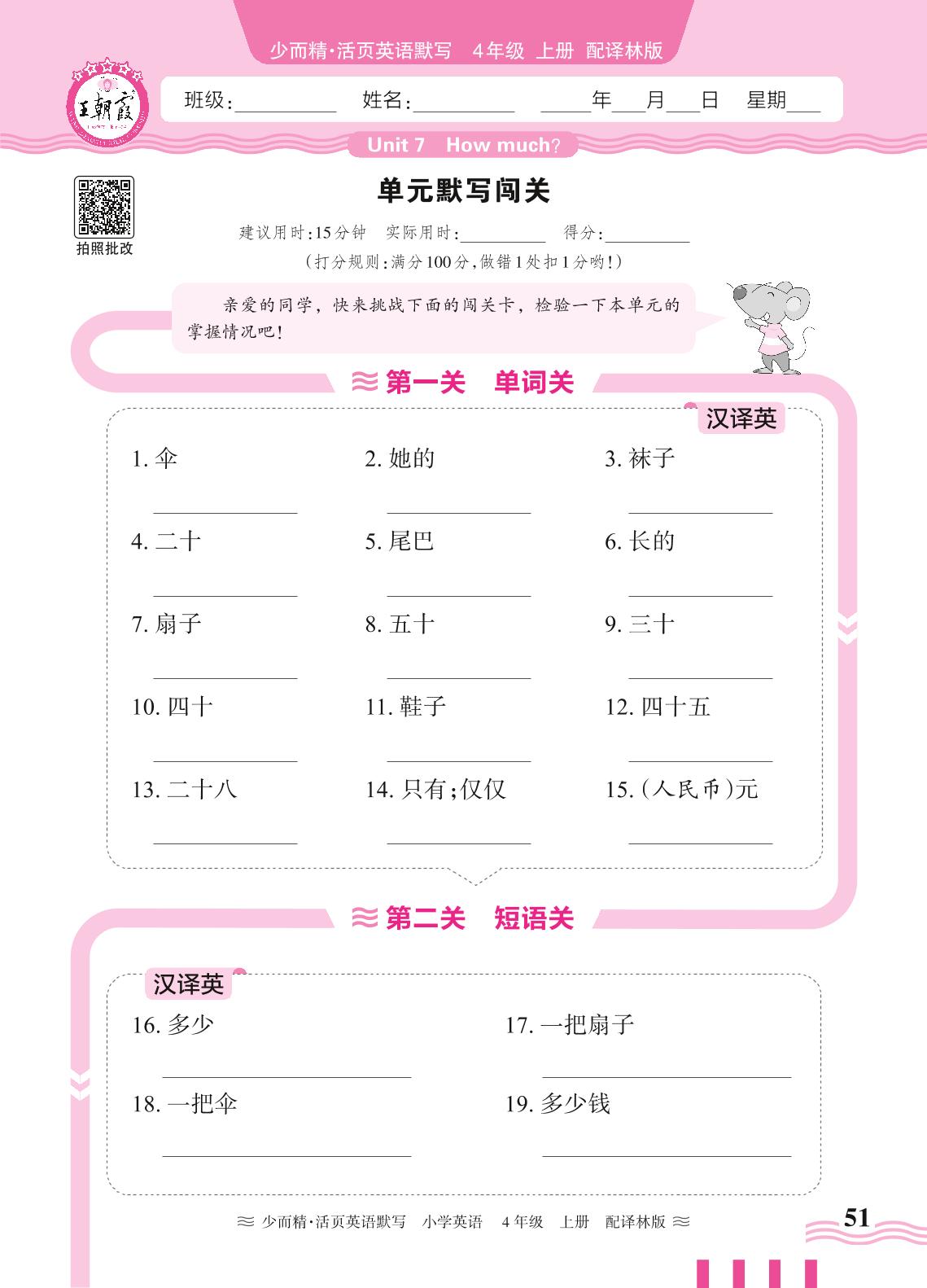 2024秋上册四年级英语译林版(三起始) Unit 7 单元默写闯关