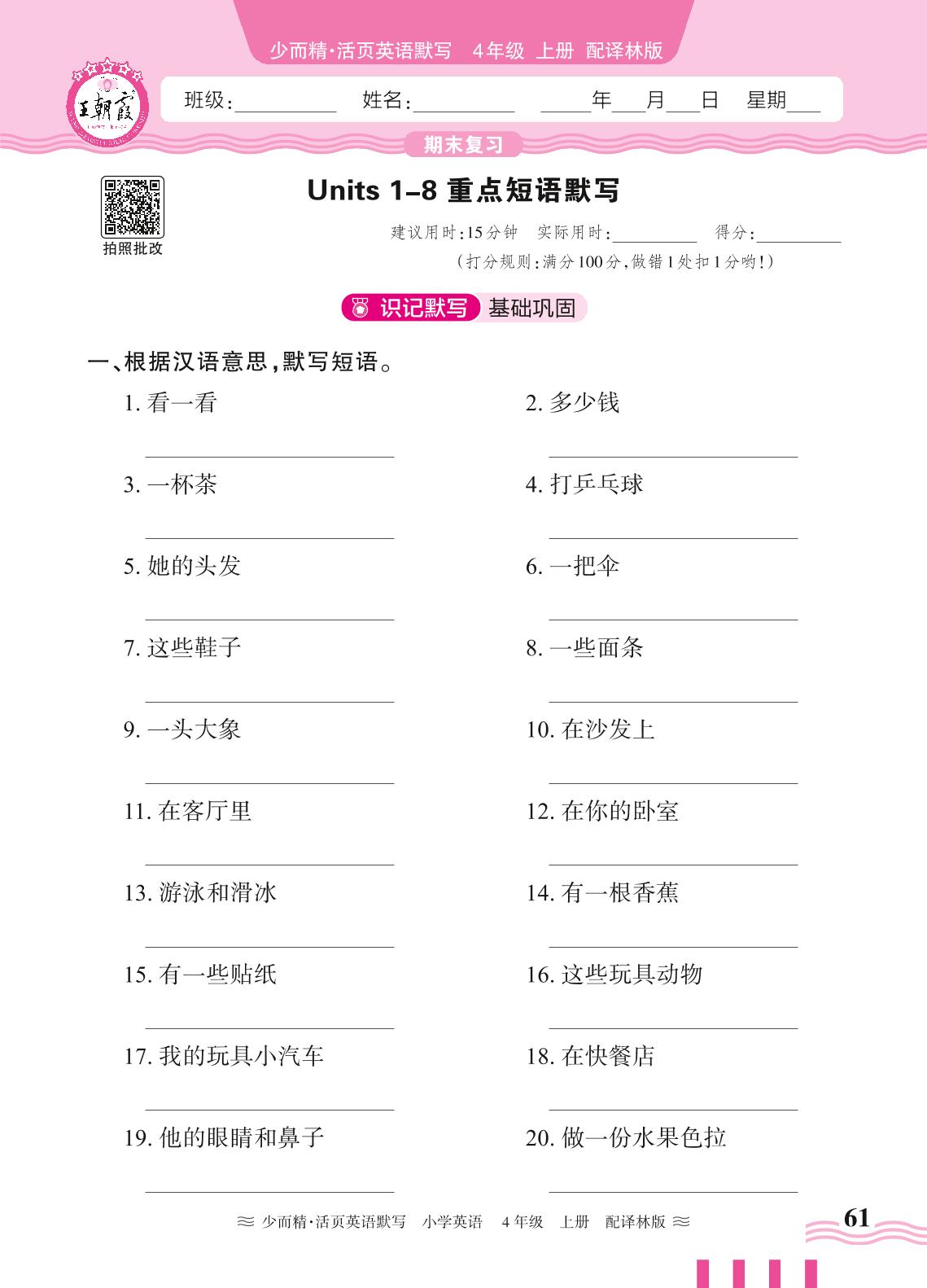 2024秋上册四年级英语译林版(三起始) Units 1-8 重点短语默写