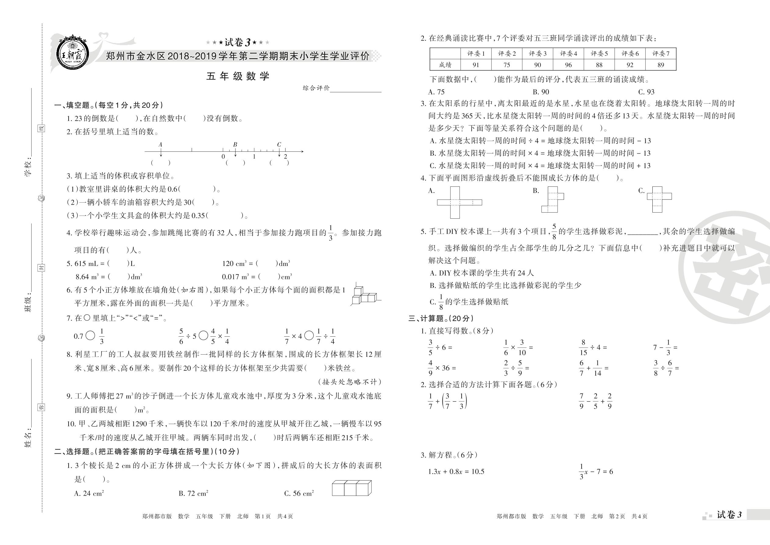 2018-2019学年第二学期郑州市金水区五年级数学试卷(北师版)【3】