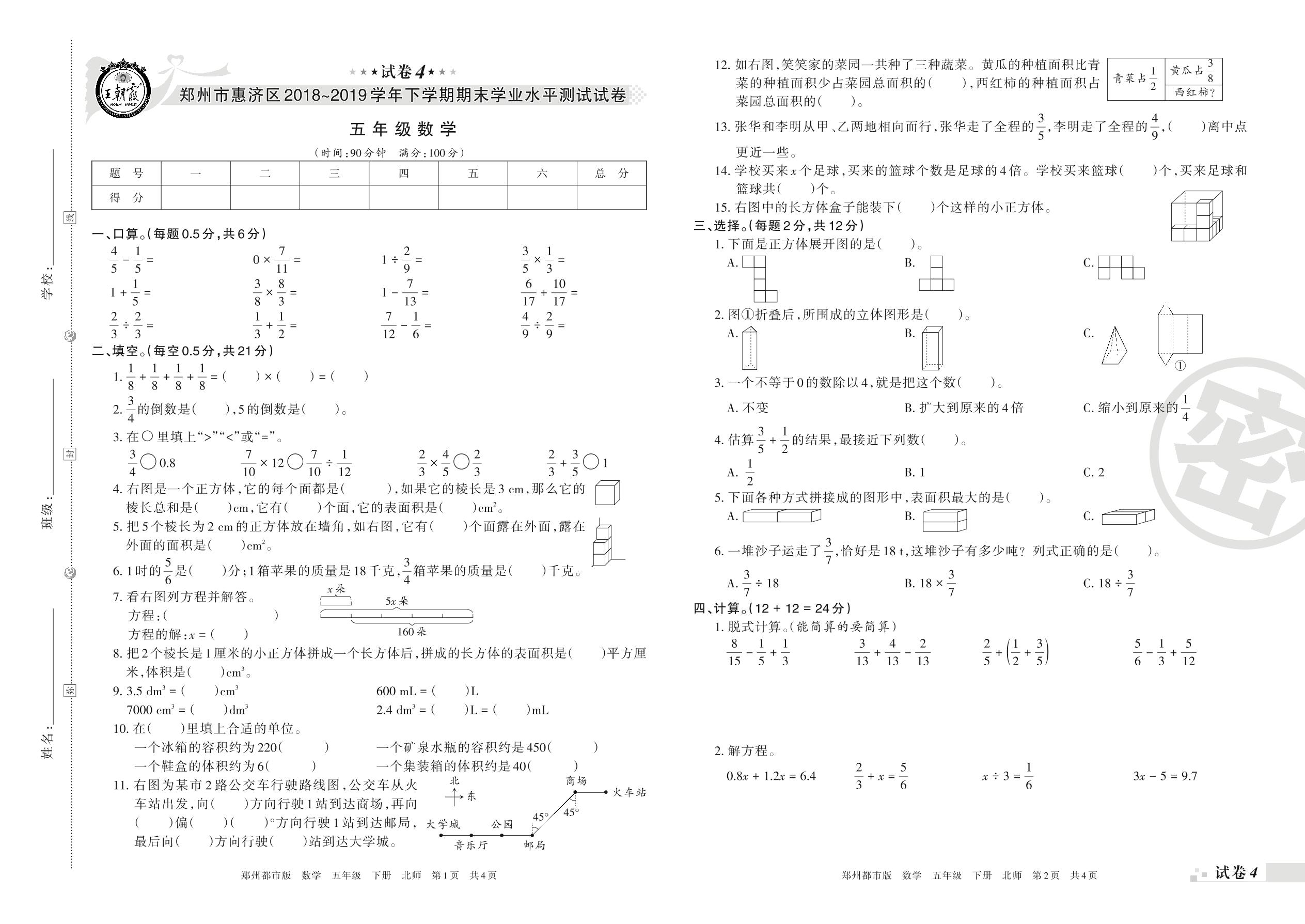 2018-2019学年第二学期郑州市惠济区五年级数学试卷(北师版)【4】