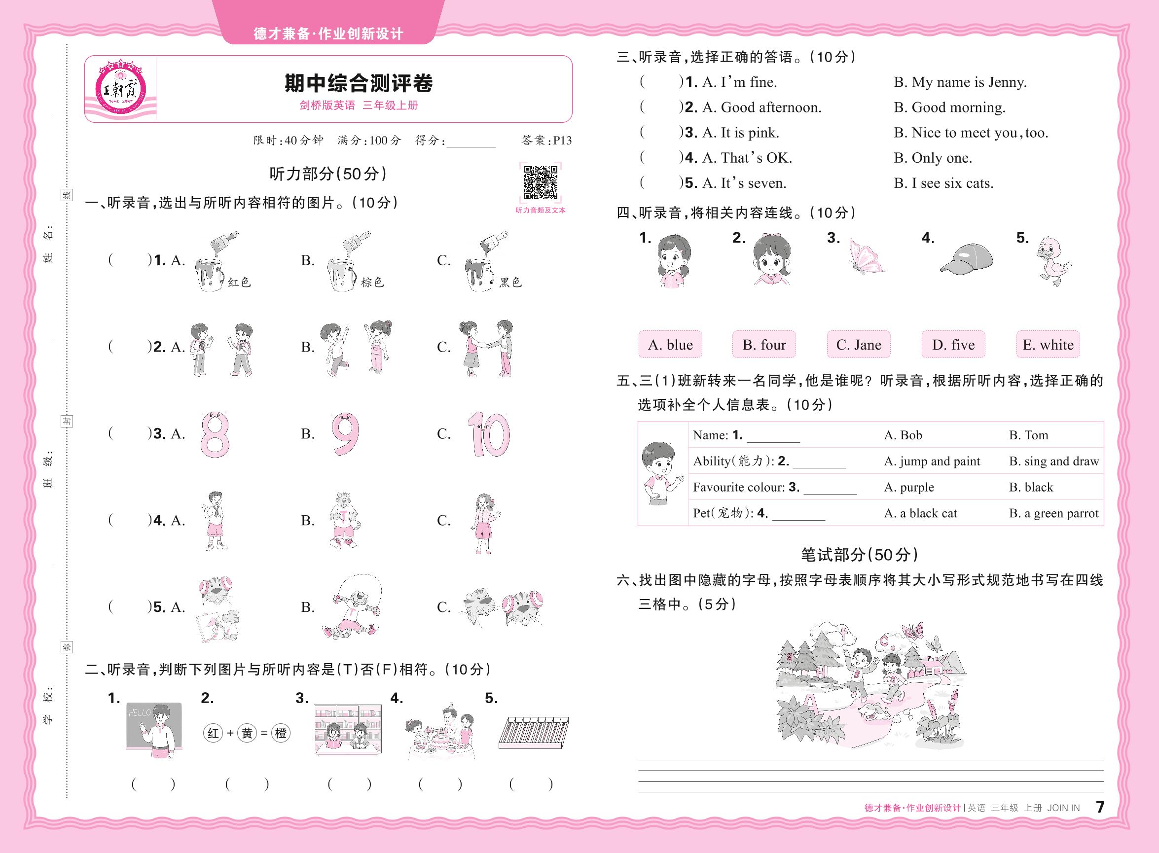 2024秋上册三年级英语剑桥版 期中综合测评卷