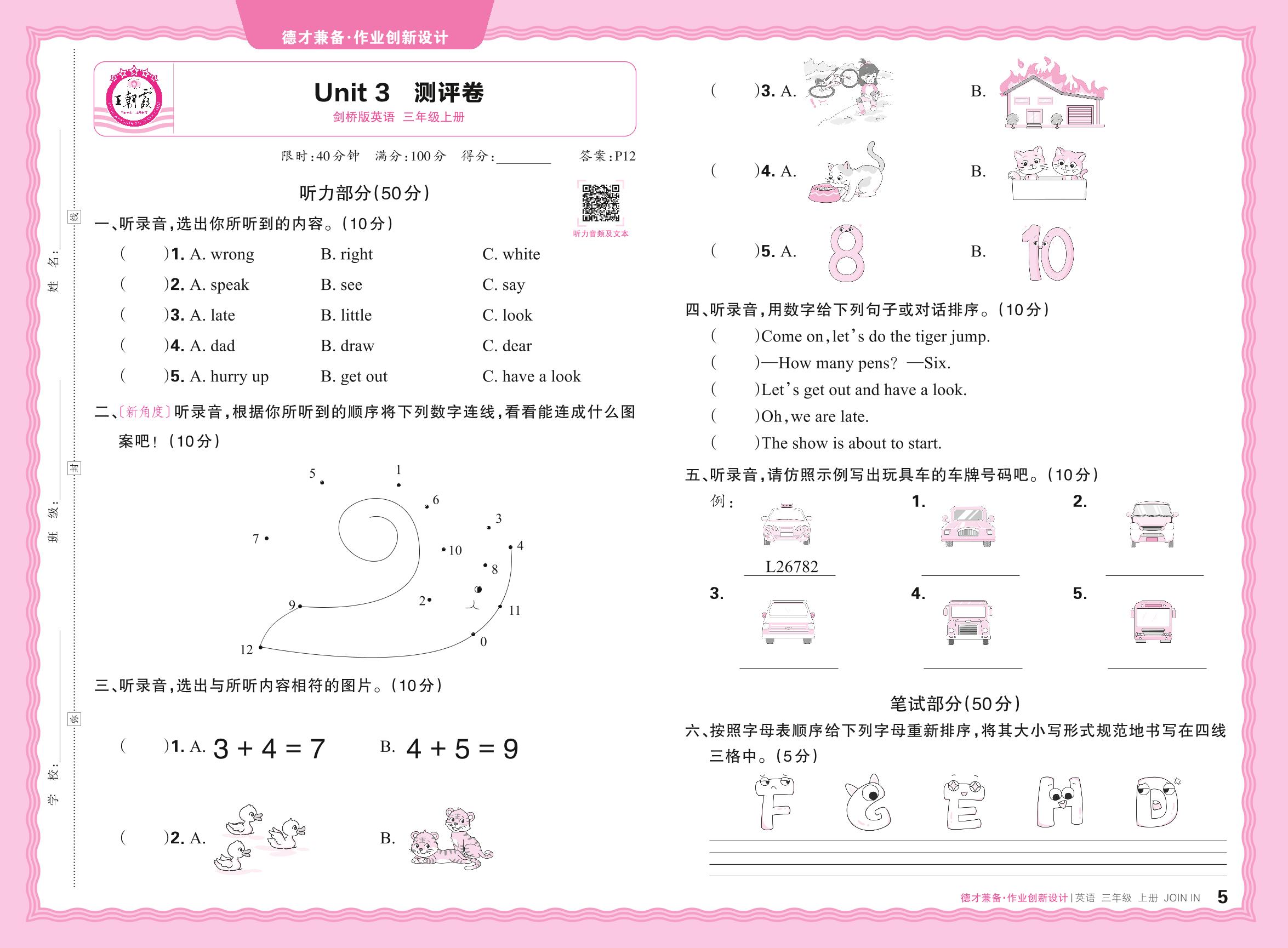 2024秋上册三年级英语剑桥版 Unit 3 测评卷
